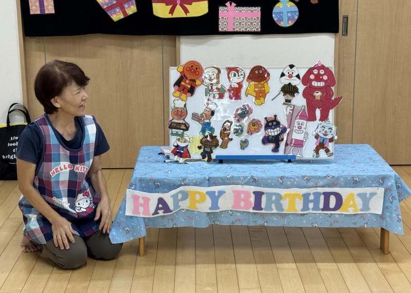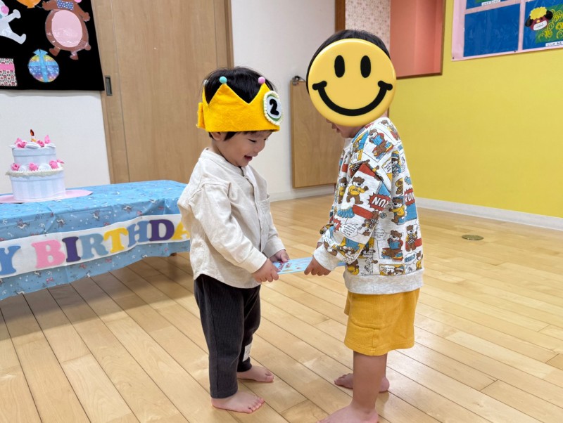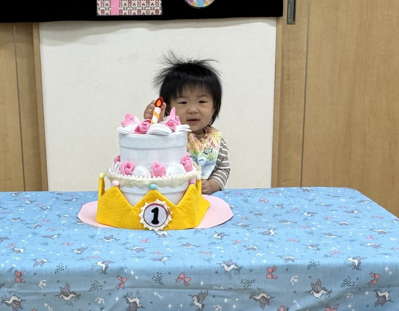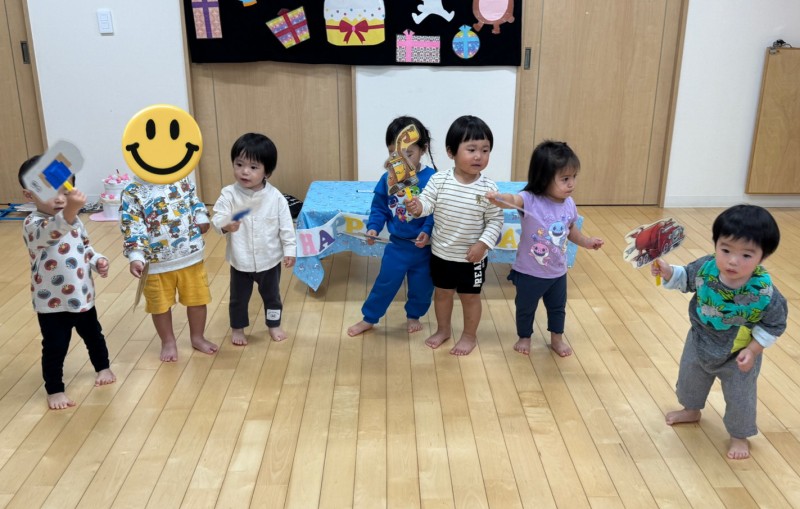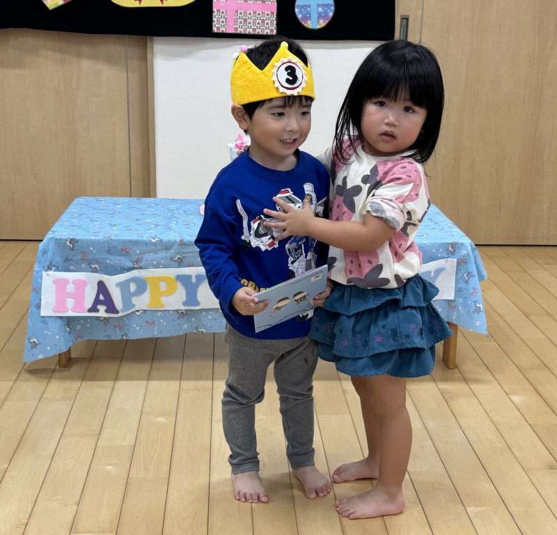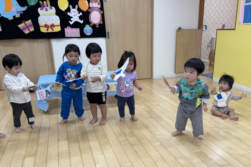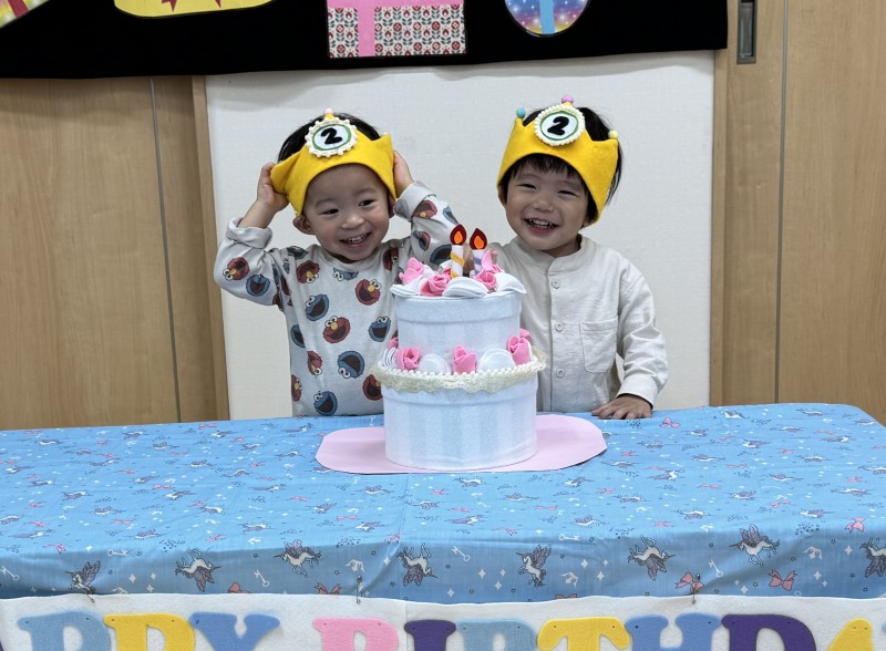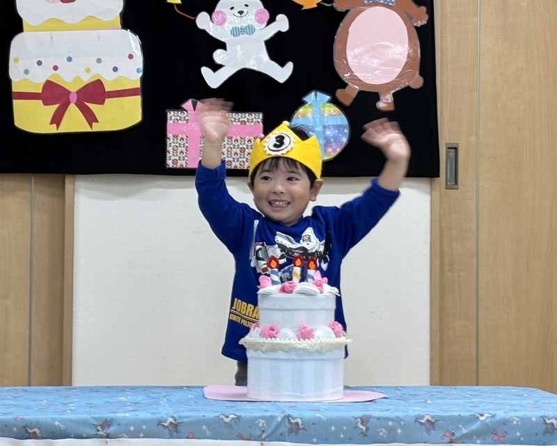 イベント 日付:2026.01.16 🎂1月 お誕生会🎂 1月生まれのお誕生会を行いました 今月の主役は、4名のお友だちです みんなの前に出ると少し照れながらも嬉しそうな表情を見せていました お友だちから誕生カードやメダルをもらうと、にこにこ笑顔 大切そうに受け取る姿がとても微笑ましかったです 保育者の出し物では、『アンパンマン』のパネルシアターを楽しみました 大好きなキャラクターが登場すると目を輝かせて見入っていましたよ また、『はたらくくるま』のペープサートでは、子どもたちが前に出て披露してくれ、大盛り上がりでした