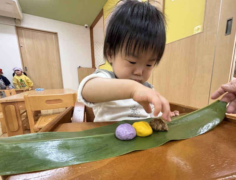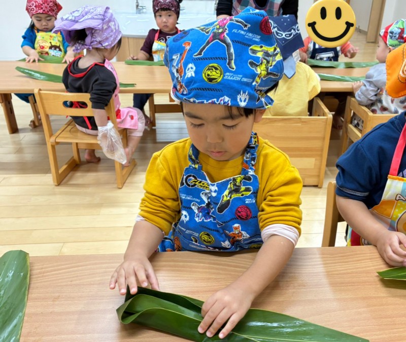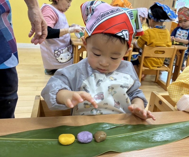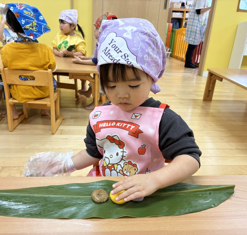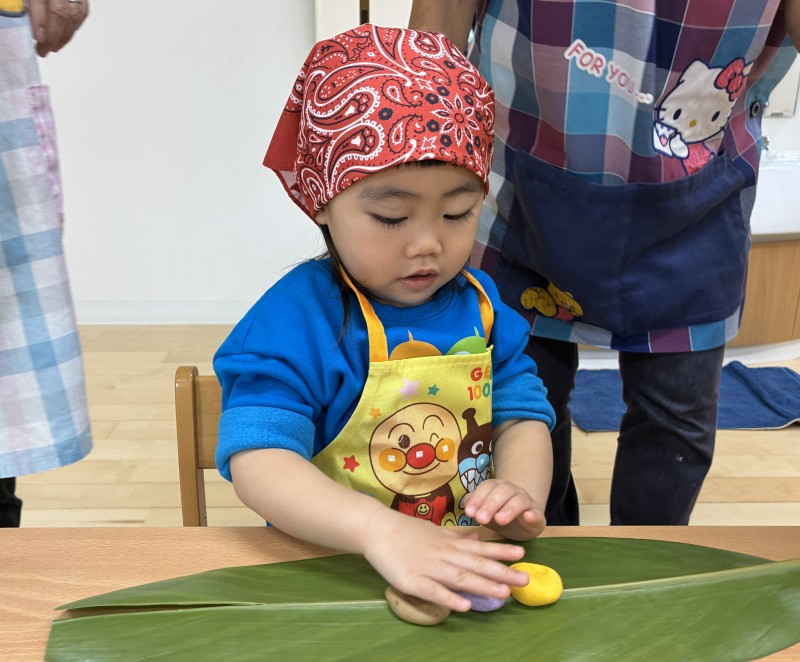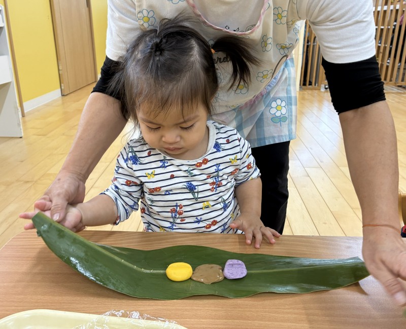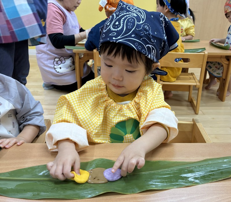 イベント 日付:2026.01.26 🌟ムーチー作り🌟 1月26日に『ムーチー作り』を行いました 「今日は、ムーチー作るんだよね」「ムーチーで鬼さんやっつけるんだよ」と張り切っている子どもたち 集会では、ムーチーの由来や作り方についての紙芝居を見たり、『ムーチーの歌』をみんなで歌い行事の雰囲気を楽しみました 初めて見るムーチーやカーサに興味深々 保育者と一緒にムーチーをこねたり、カーサで包んだりと苦戦しながらも一生懸命作っている子どもたちでした
