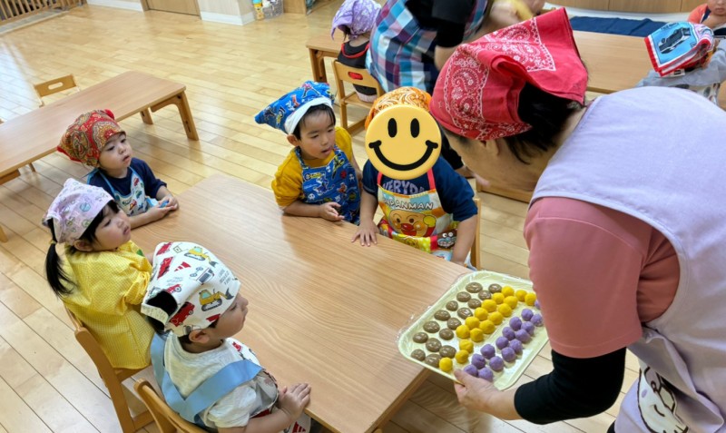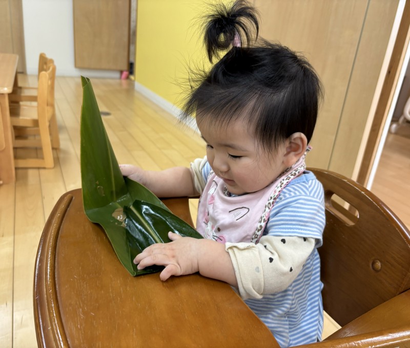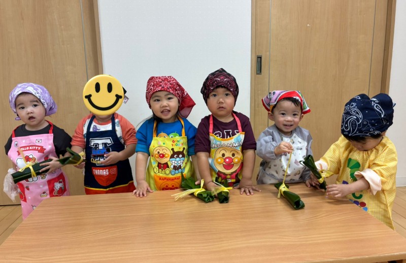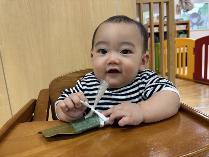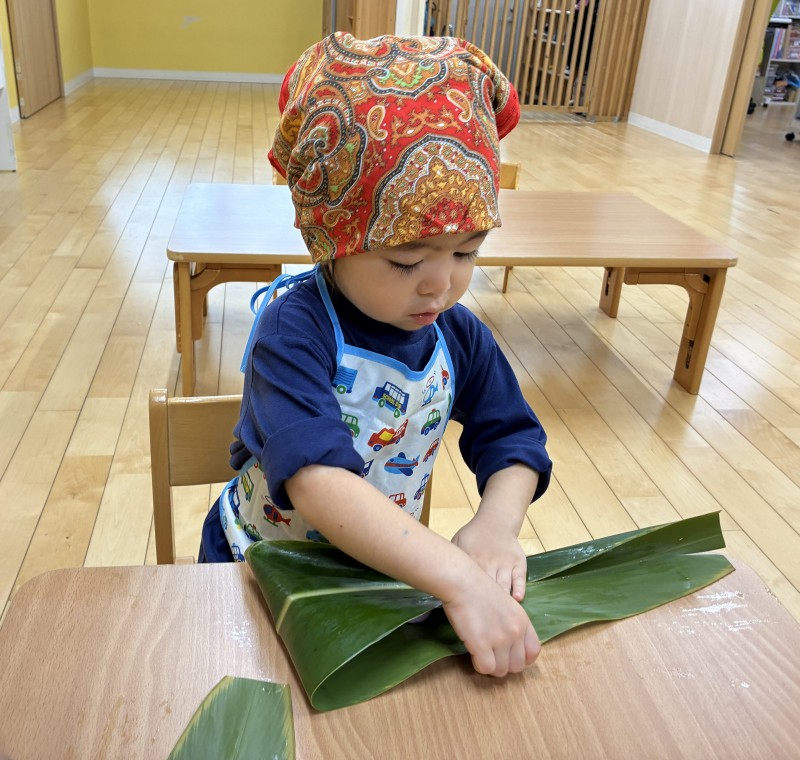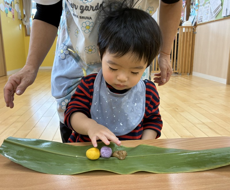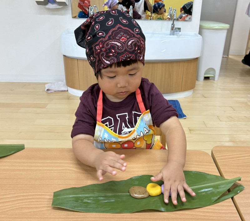 イベント 日付:2026.01.26 🌟ムーチー作り🌟 1月26日に『ムーチー作り』を行いました 「今日は、ムーチー作るんだよね」「ムーチーで鬼さんやっつけるんだよ」と張り切っている子どもたち 集会では、ムーチーの由来や作り方についての紙芝居を見たり、『ムーチーの歌』をみんなで歌い行事の雰囲気を楽しみました 初めて見るムーチーやカーサに興味深々 保育者と一緒にムーチーをこねたり、カーサで包んだりと苦戦しながらも一生懸命作っている子どもたちでした