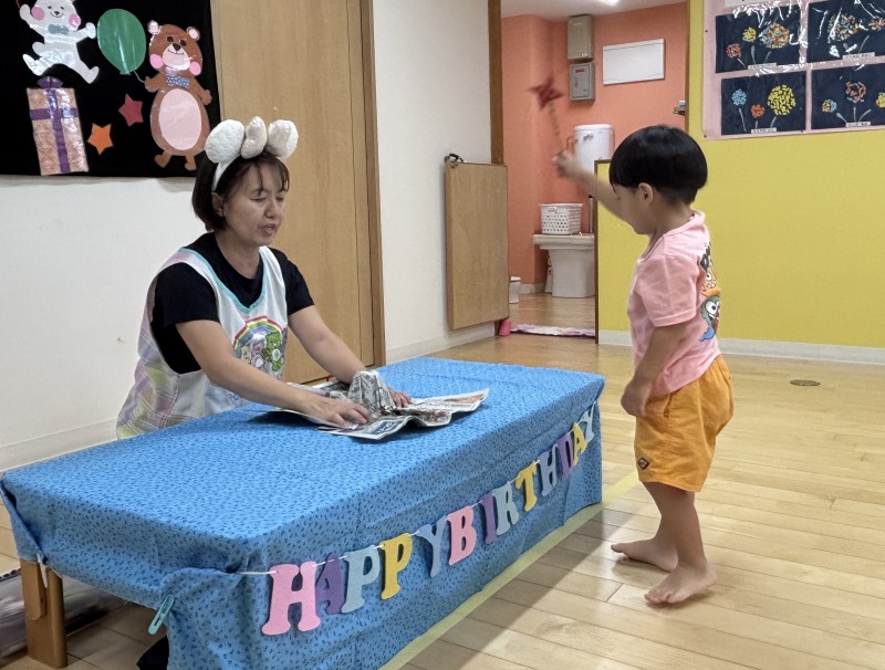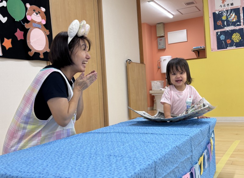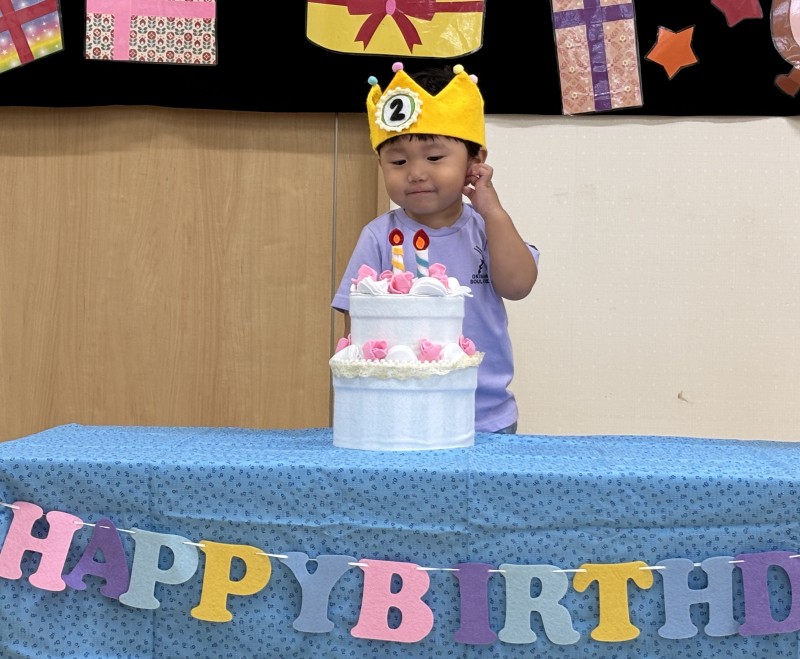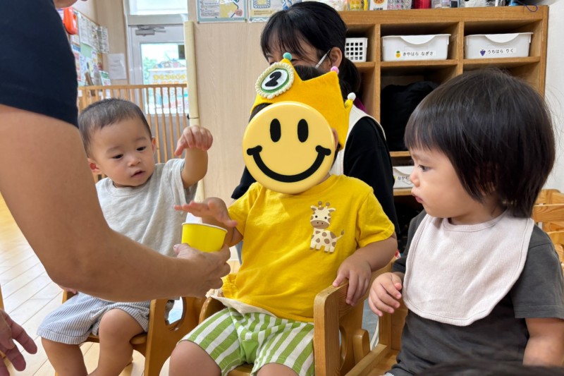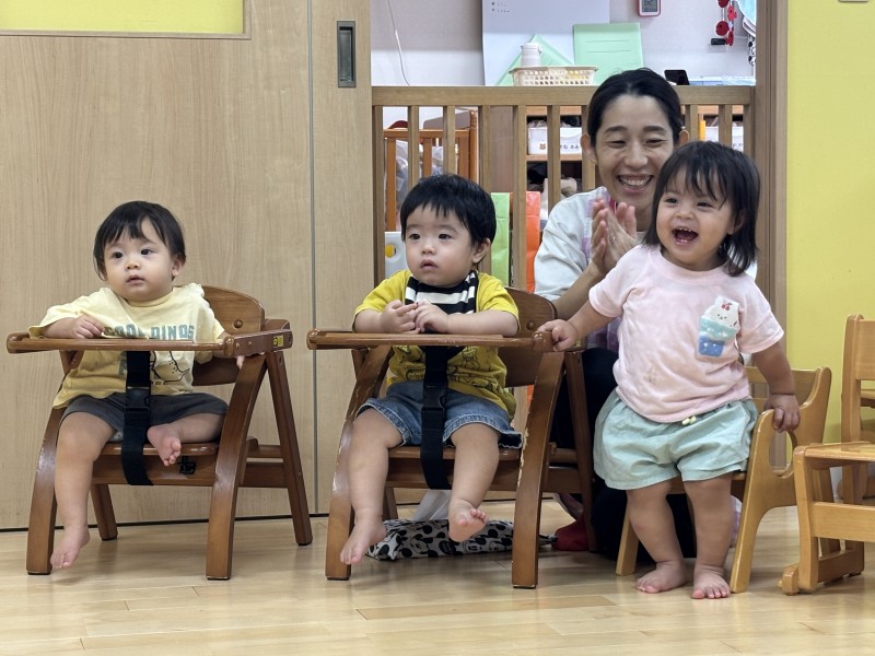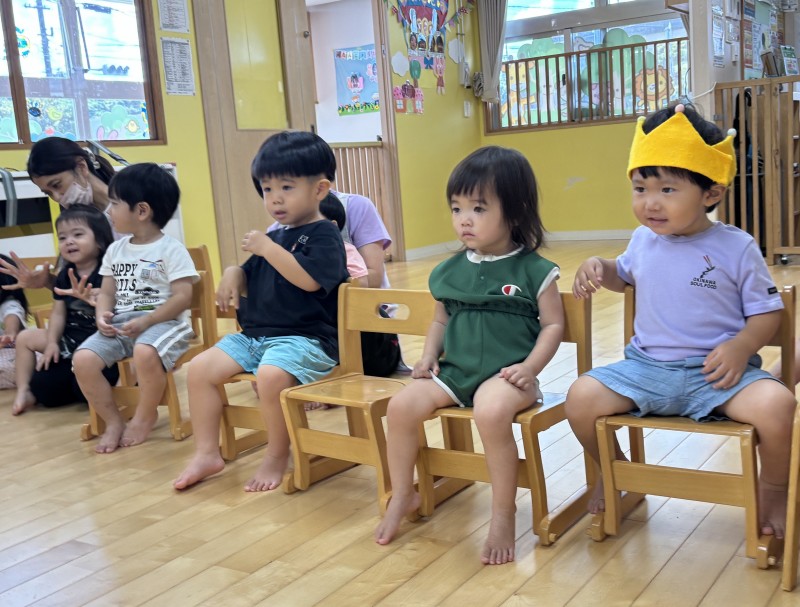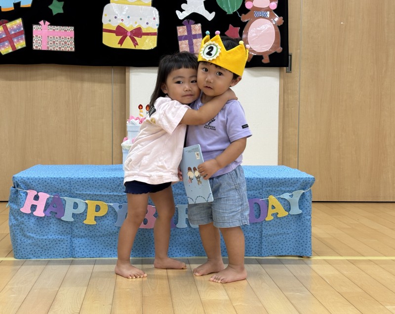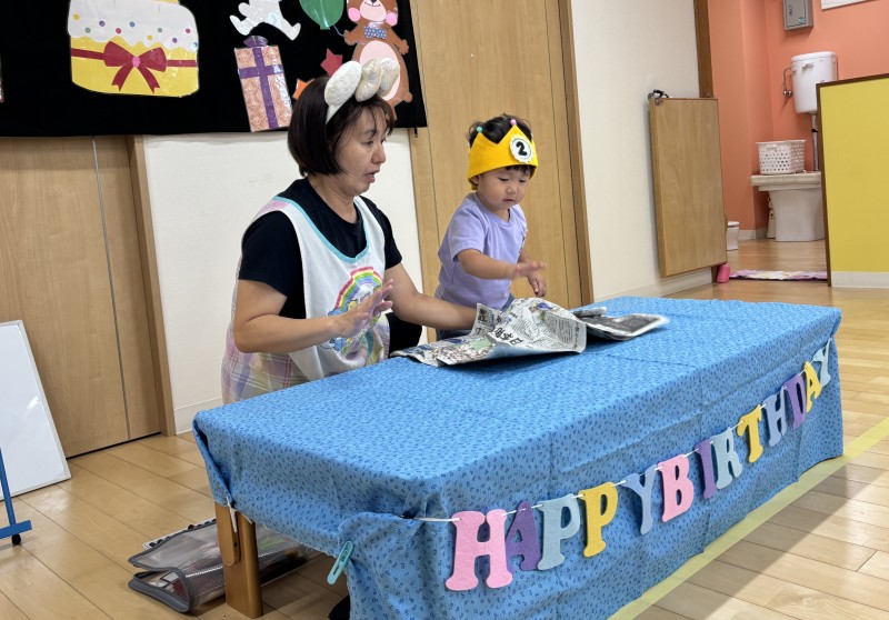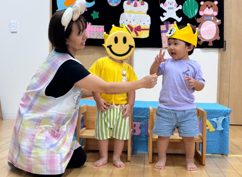 イベント 日付:2025.09.19 🎂9月 お誕生会🎂 9月生まれのお誕生会を行いました 今月は、2名の可愛らしいお友だちが主役です 誕生児インタビューでは、ドキドキ緊張した表情を見せていましたが、「○○です!2歳です✌」と答える事ができましたよ 保育者の出し物では、手袋シアターやマジックを楽しみました ボールマジックでは、コップに入れたボールがなくなると、「どこに行っちゃったの⁈⁈」と驚く子どもたち👀💦再びコップからボールが現れると「わぁ~~」と喜び大興奮でした