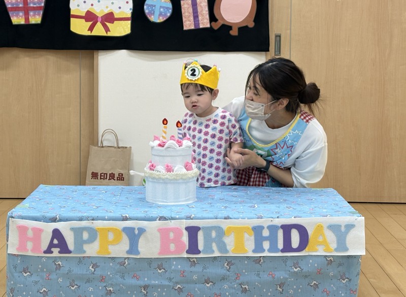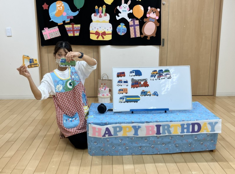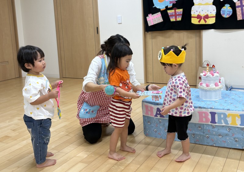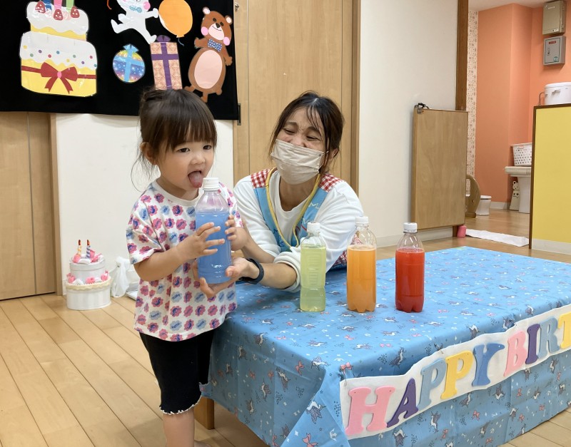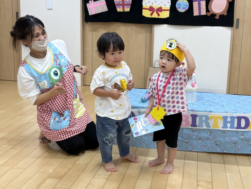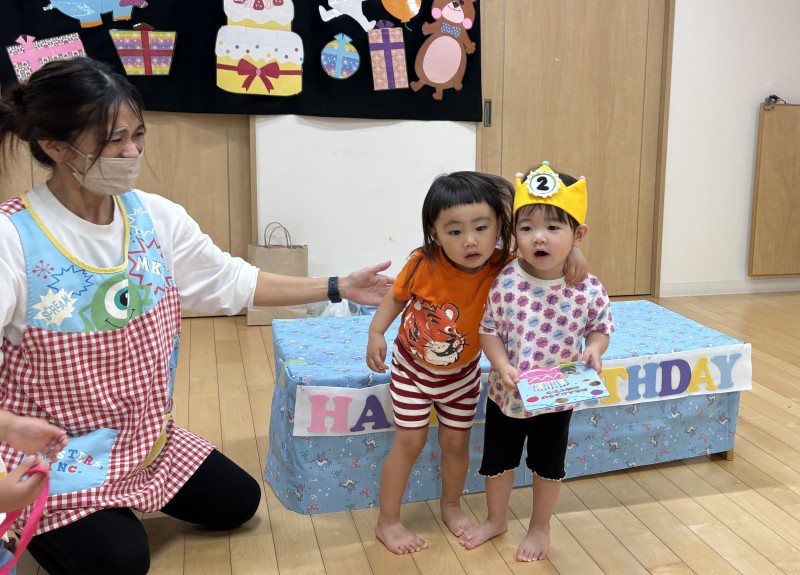 イベント 日付:2026.01.16 🎂12月 お誕生会🎂 12月お誕生会の主役は、2歳の可愛らしいお友だちです お友だちの前に出ると少し緊張した様子も見られましたが、冠をかぶるとにこっと笑顔を見せていましたよ お誕生会では、子どもたちの大好きな『はたらくくるま』のパネルシアターや色水マジックなどを楽しみました♪ 色水マジックでは、子どもたちがお手伝い 赤・青・黄色と色が変わると「わぁ~すご~い」と色水に釘付けになっていました