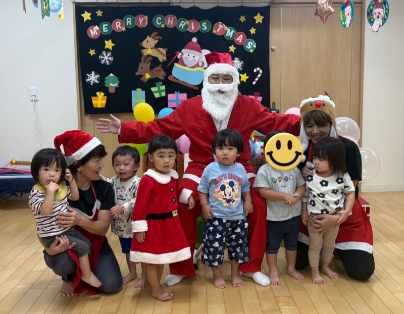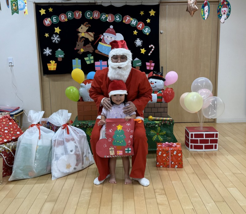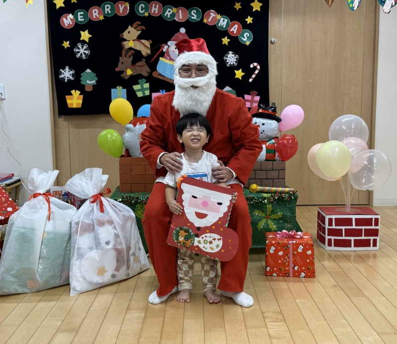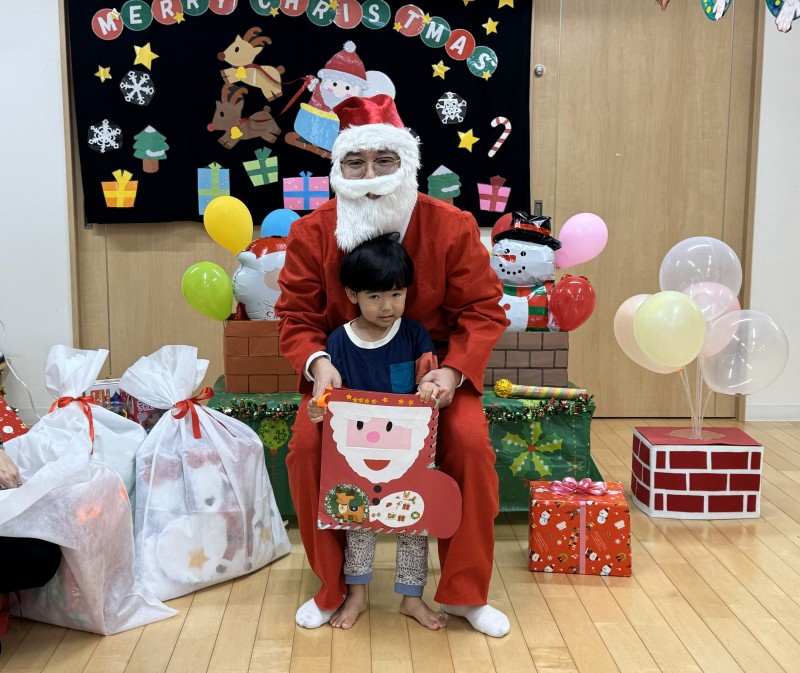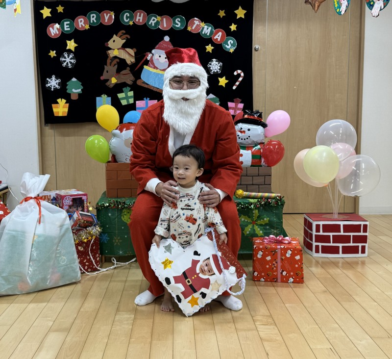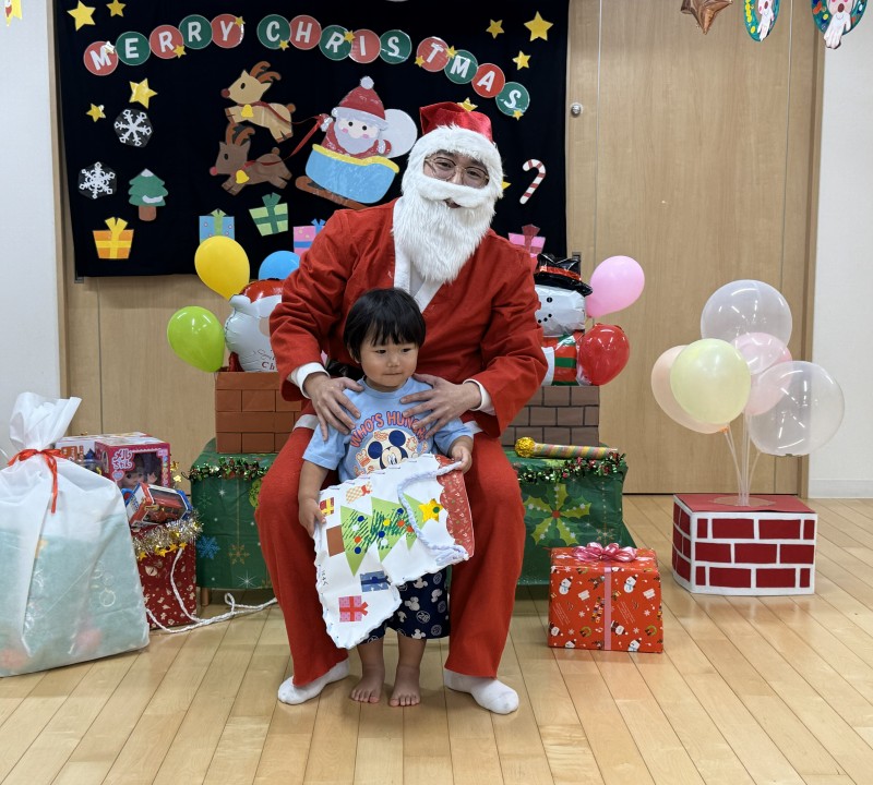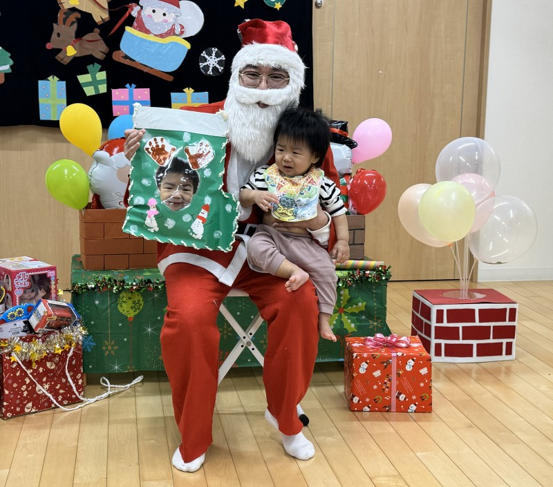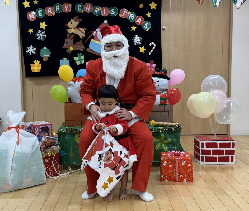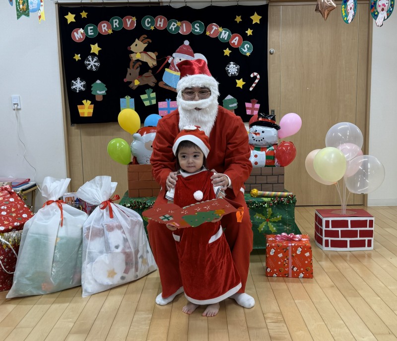 イベント 日付:2026.01.16 🎄クリスマス会🎄 12月25日にクリスマス会を行いました 『赤鼻のトナカイ』や『まんまるちゃん』のパネルシアターを見たり、歌や遊戯を楽しみました 集会の途中にサンタさんが登場すると、ドキドキしながらも嬉しそうな表情を見せる子どもたち 緊張しながらも、サンタさんからプレゼントを受け取り、笑顔いっぱいのクリスマス会となりました