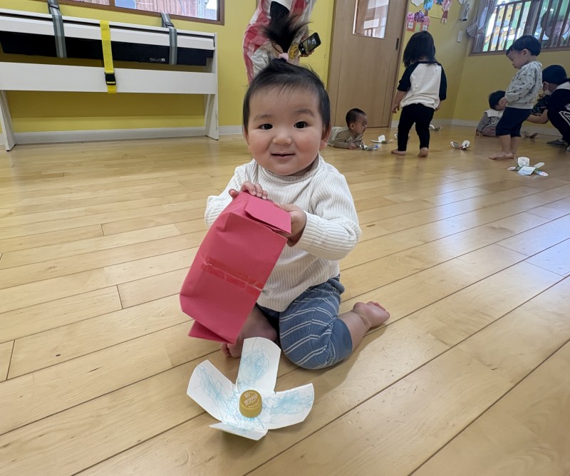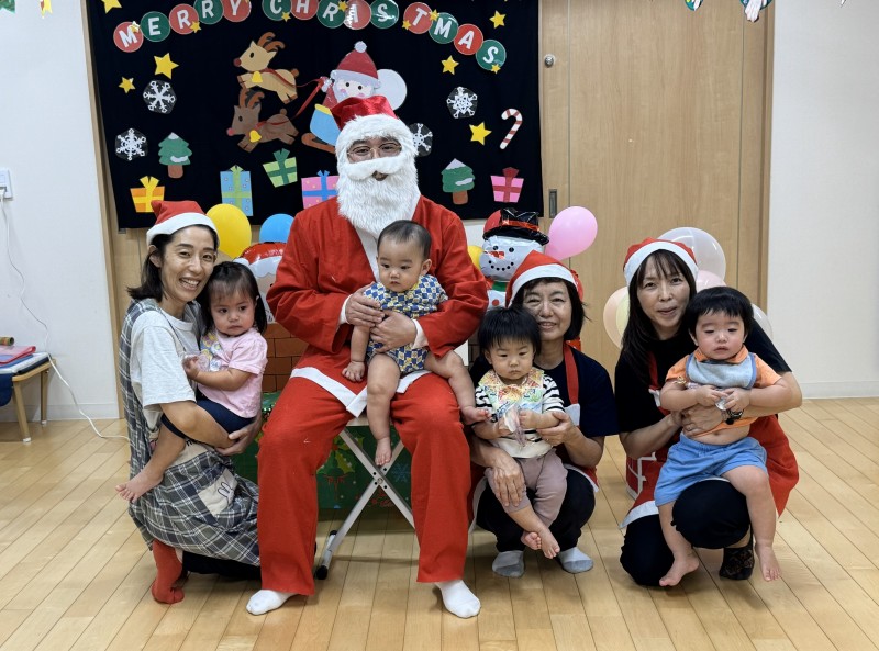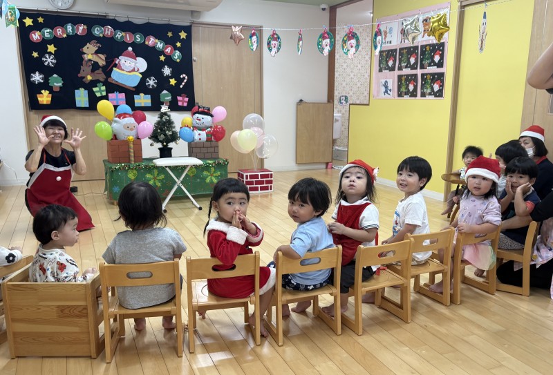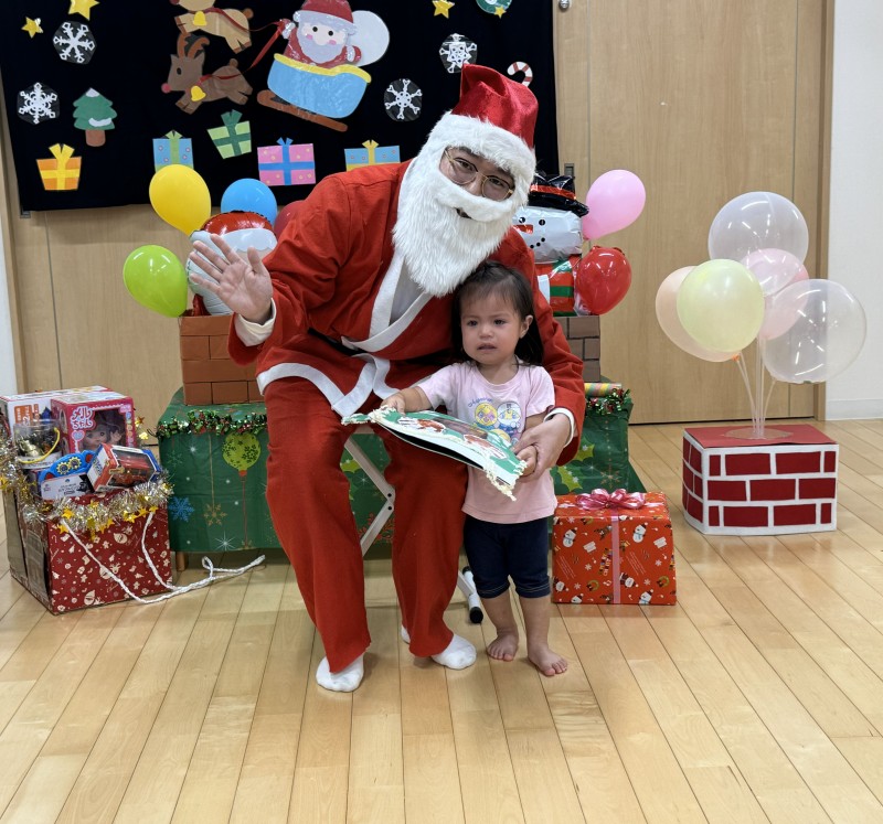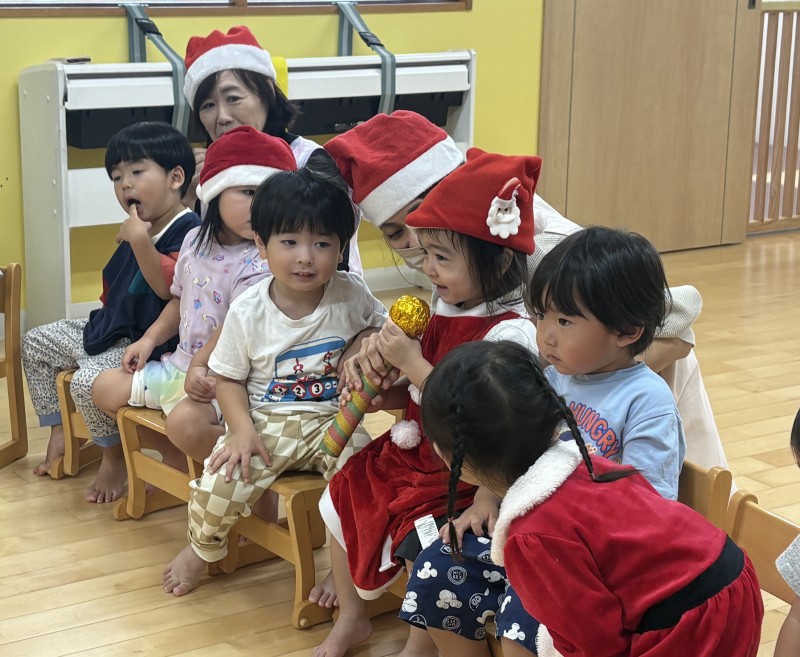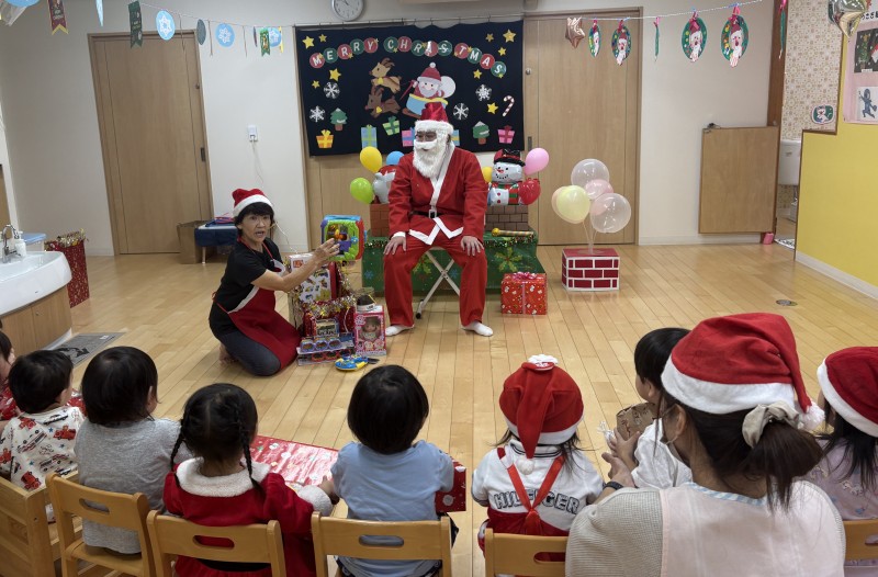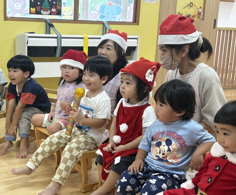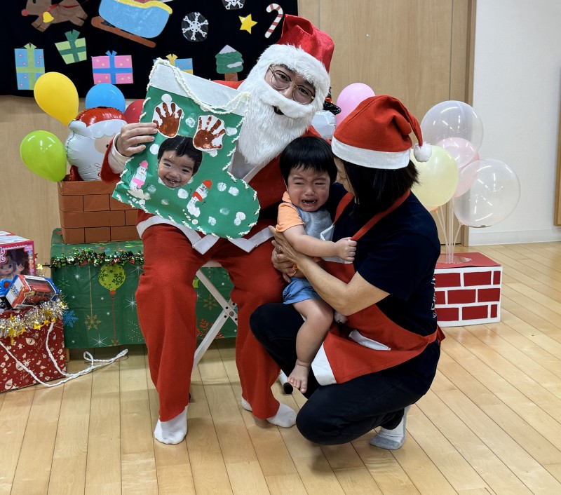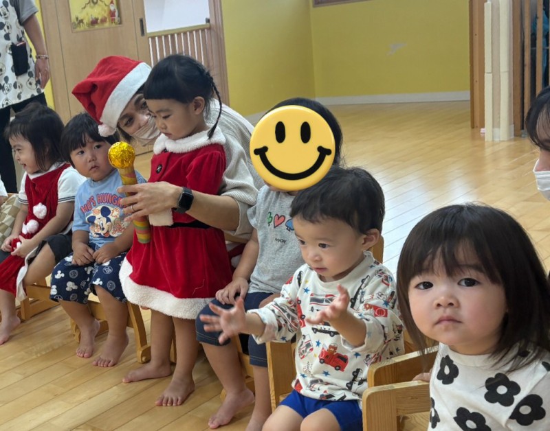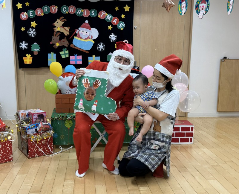 イベント 日付:2026.01.16 🎄クリスマス会🎄 12月25日にクリスマス会を行いました 『赤鼻のトナカイ』や『まんまるちゃん』のパネルシアターを見たり、歌や遊戯を楽しみました 集会の途中にサンタさんが登場すると、ドキドキしながらも嬉しそうな表情を見せる子どもたち 緊張しながらも、サンタさんからプレゼントを受け取り、笑顔いっぱいのクリスマス会となりました
