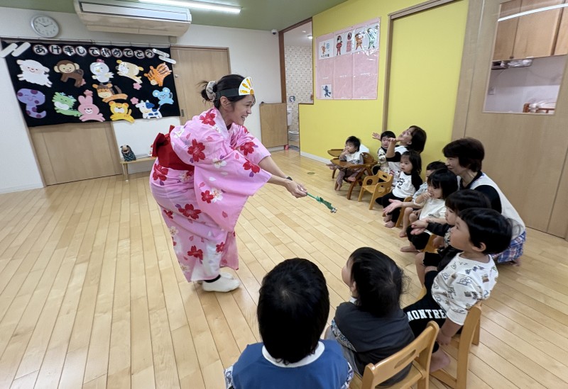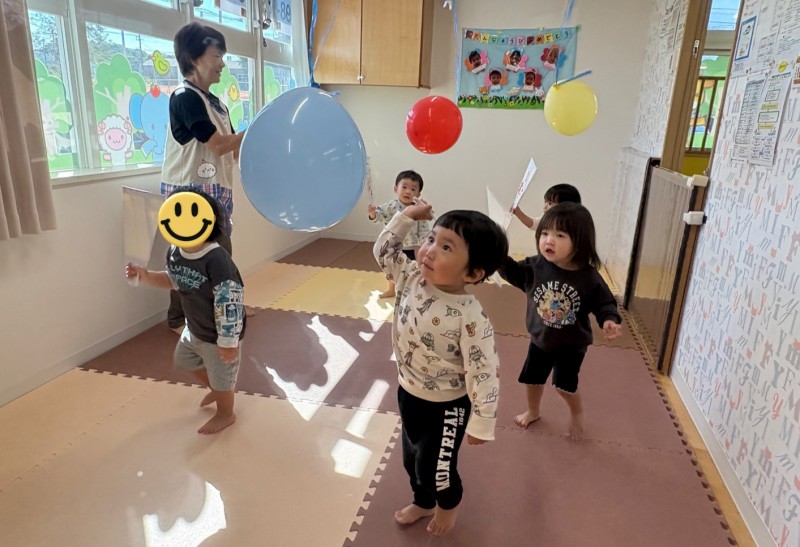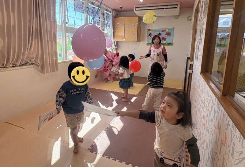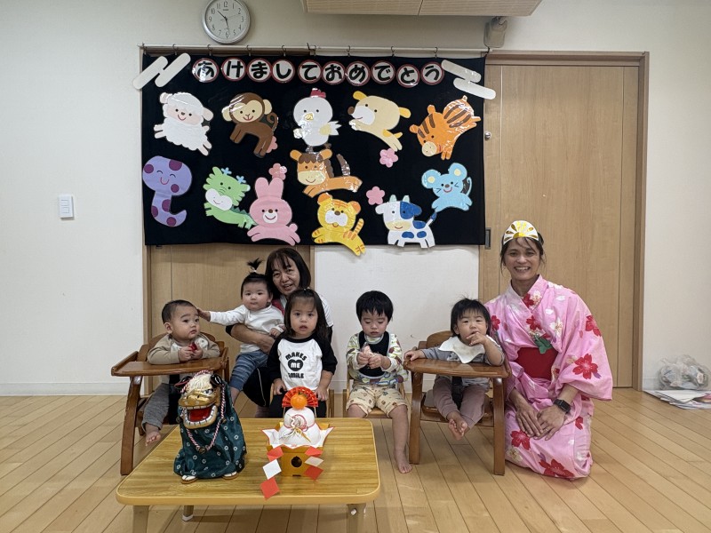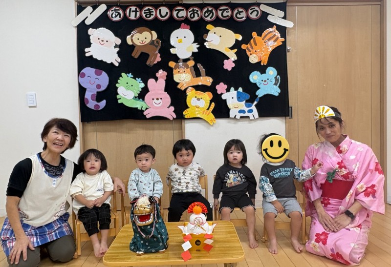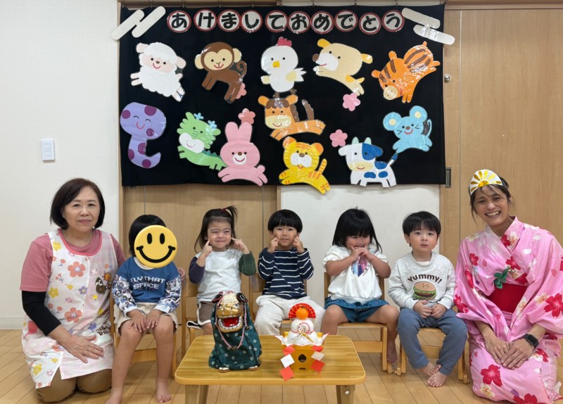 イベント 日付:2026.01.16 🎍新年の集い🎍 1月5日に新年の集いを行いました🎍 『十二支のはじまり』の紙芝居を見たり、『十二支の歌』を歌って楽しみました 集会の途中に巫女さんが登場し、今年一年みんなが元気に過ごせるよう健康祈願を行いました その後は、お正月遊びを楽しみました 手作りのコマや福笑いに挑戦したり、風船を使用した羽子板遊びでは元気いっぱい体を動かし楽しむ子どもたちでした