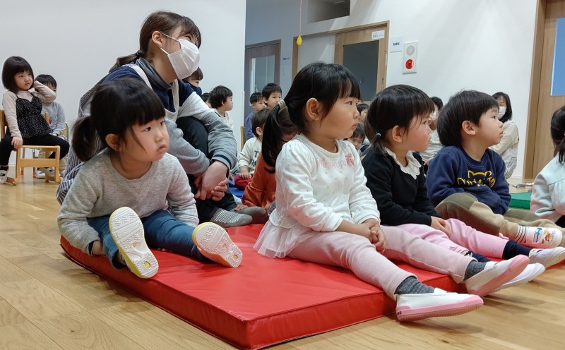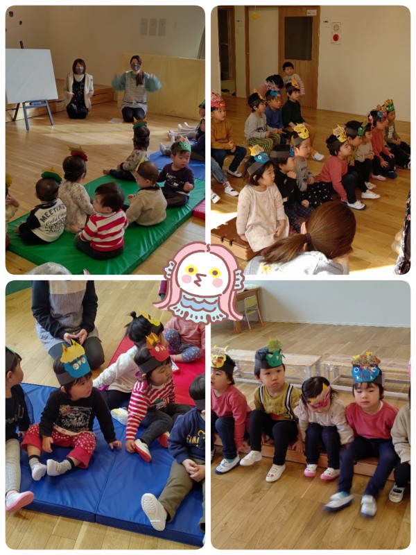 節分のお話を園長先生からしていただき、ひよこ組の先生から節分のパネルシアターを見せてもらいました。