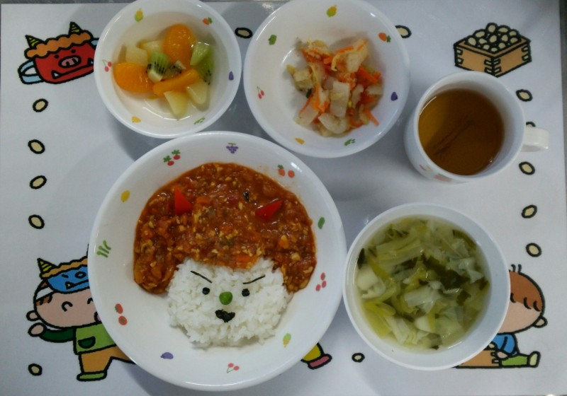 〇鬼ドライカレー〇野菜スープ〇白菜のごま酢和え〇フルーツカクテル〇