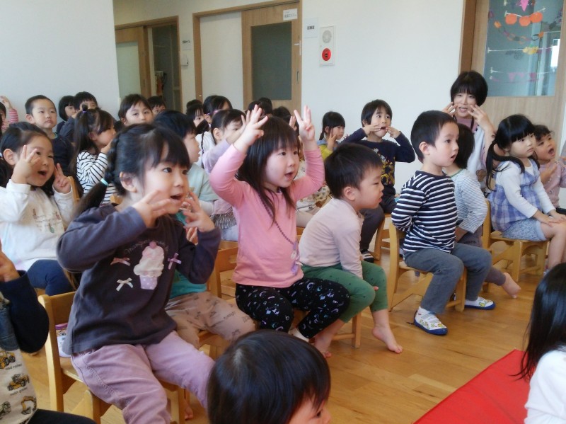 また、職員からの出し物の「どんな色が好き」ペープサートに合わせて、みんなで歌を歌いました❗️