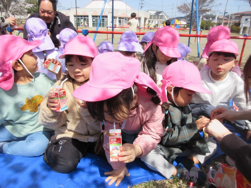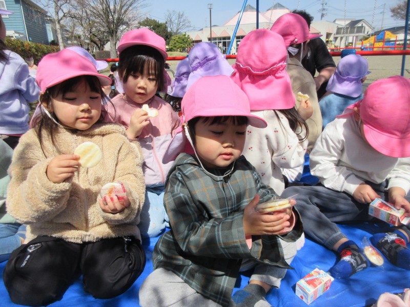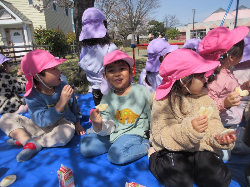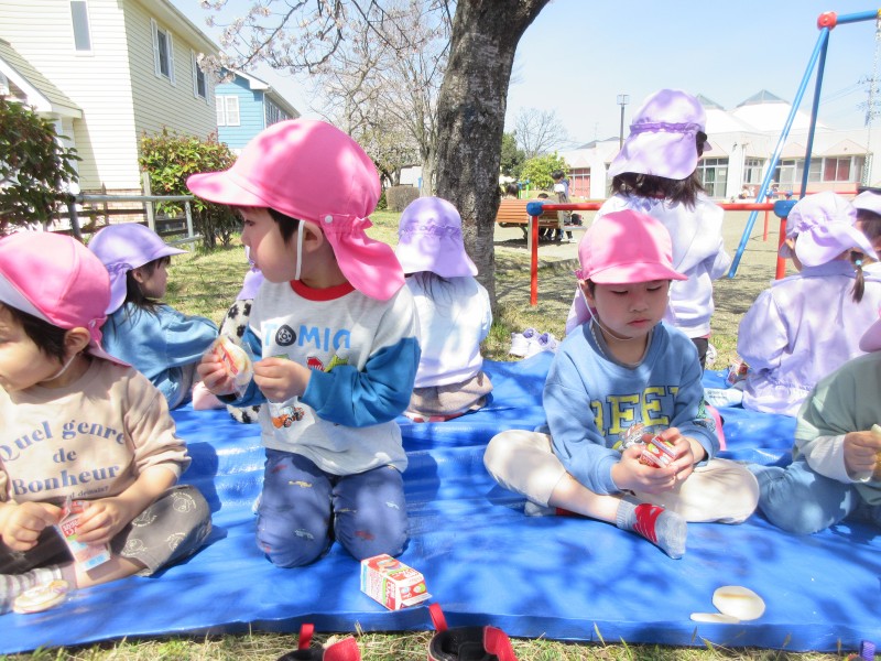 満開の桜の木の下で「美味しいおやつ、いただきます🥰❣」