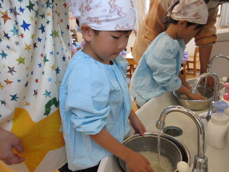 カレーを作る前に、まずお米を研ぎましょう!おにぎり作った時にやったよ