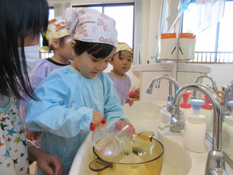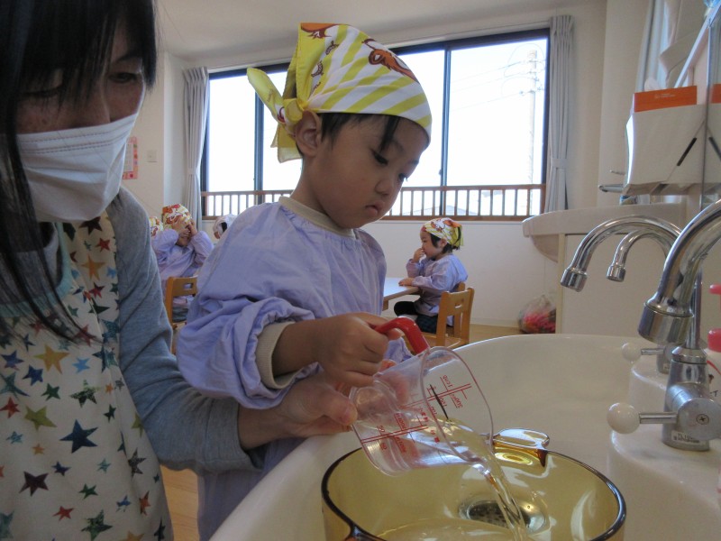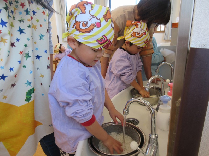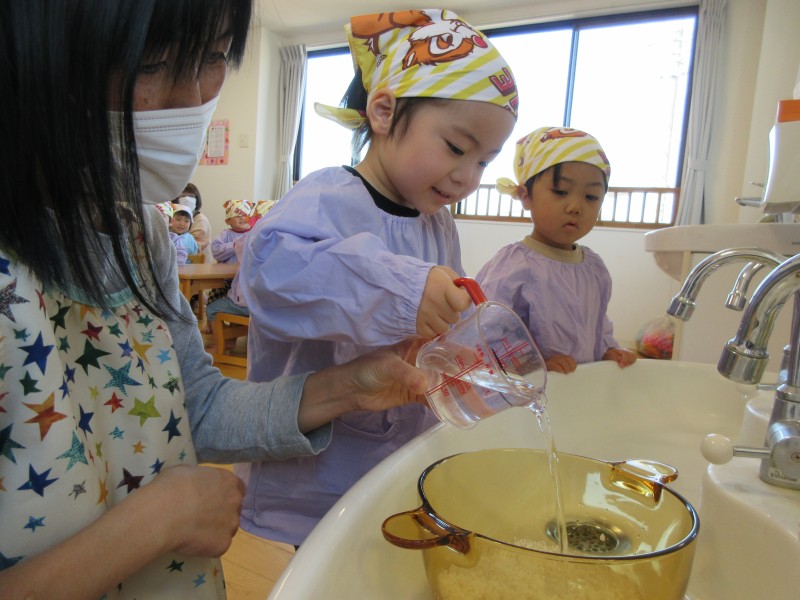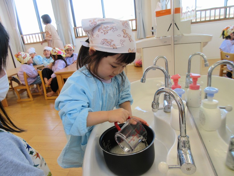 お米を研いだら、代表のお友だちにお水を入れてもらいました!