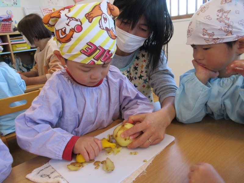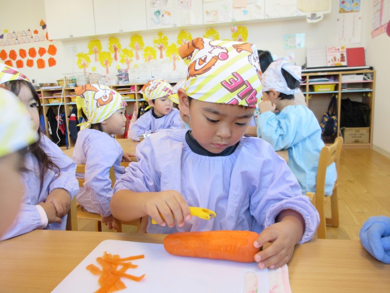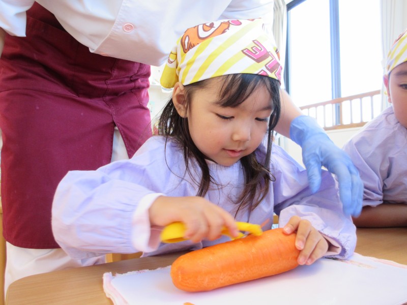 まずは野菜の皮むきから・・・。ピーラーで上手に剥いていました!