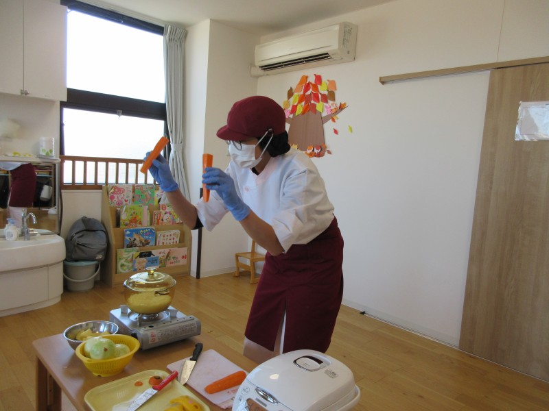 剥けた野菜を栄養士さんが皆が切り易いように少し小さく切って