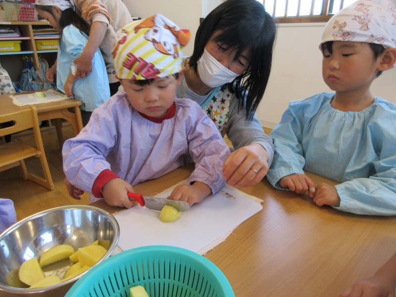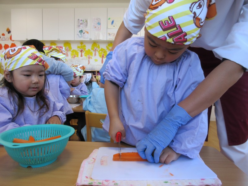 今度はみんなの番です!野菜を包丁で切ってみました!左手は猫の手・・・