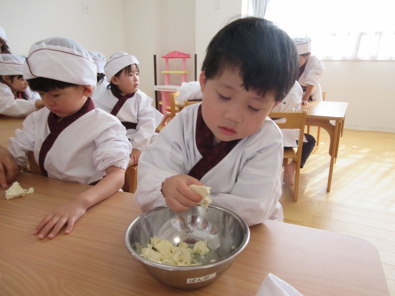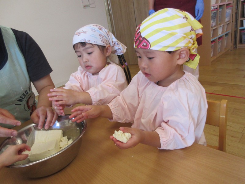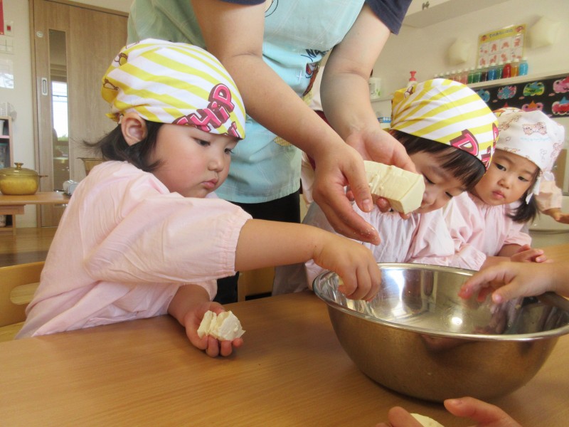 慎重にちぎる子もいれば、豪快に進める子もおり、大小さまざまな豆腐になりました👍