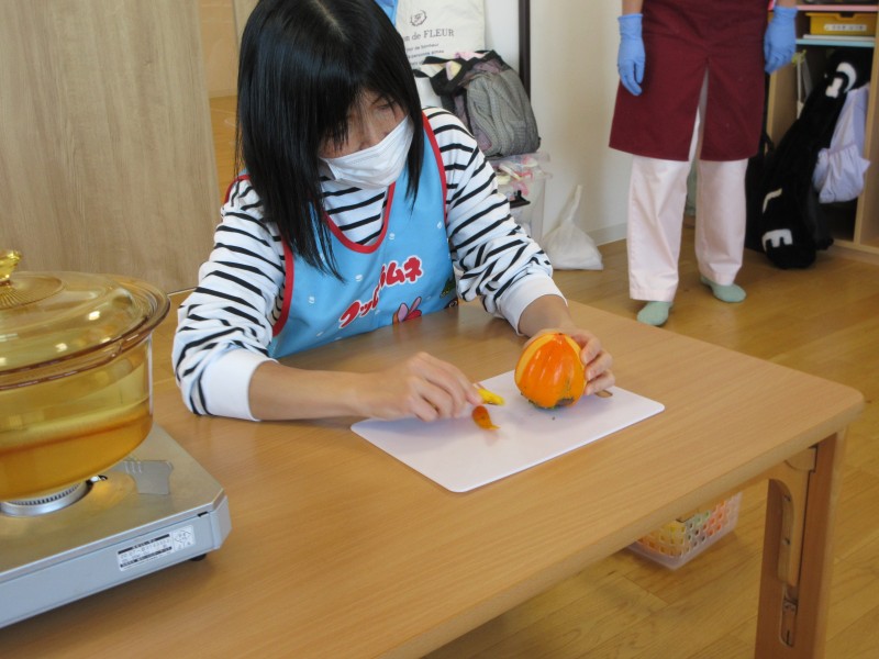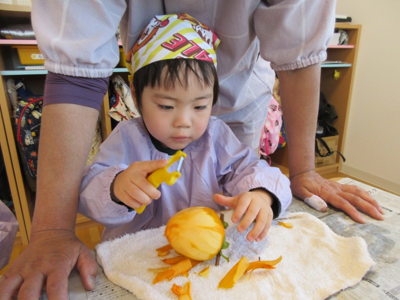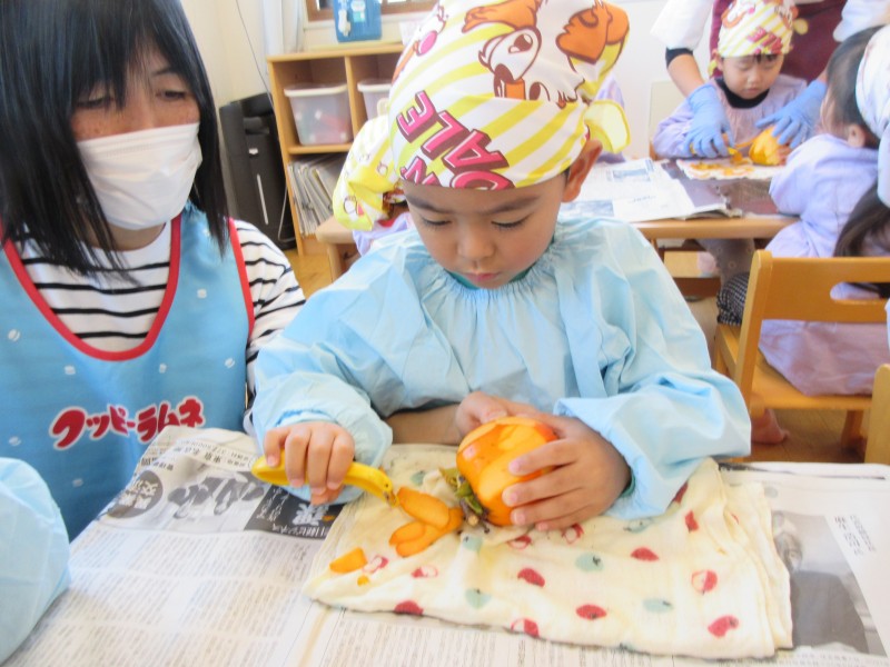 まずは野菜の皮むきから・・・。ピーラーで上手に剥いていました!