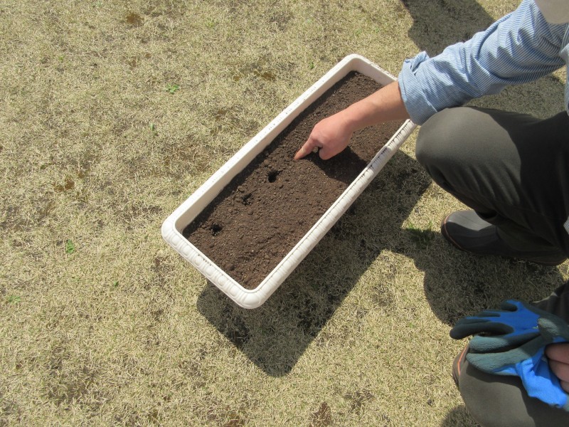 畑より小さい穴に何粒かまとめて蒔いていきます。