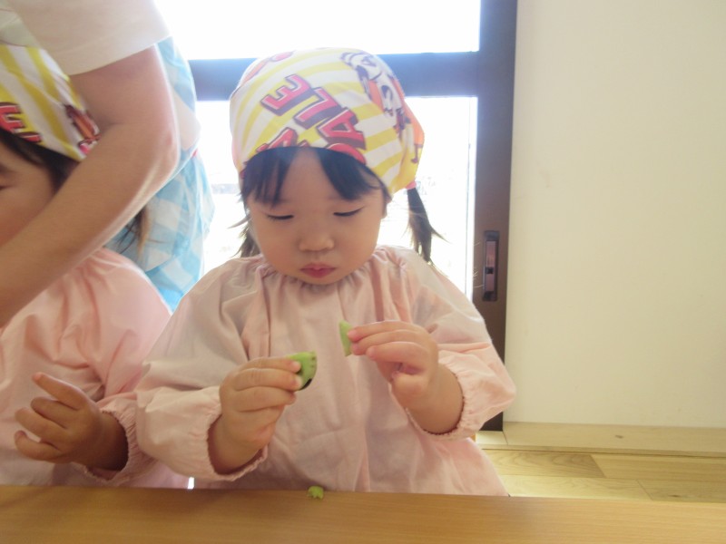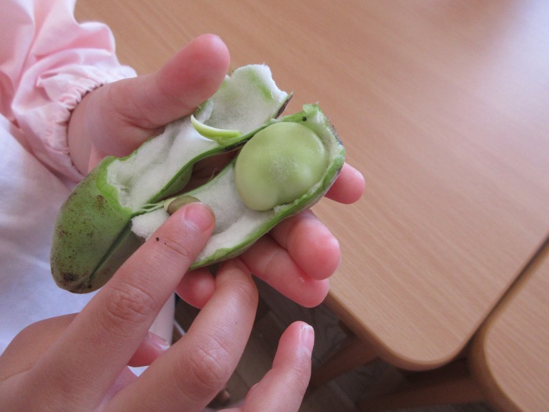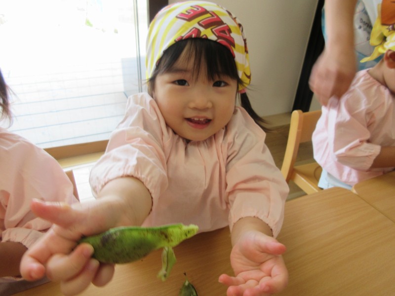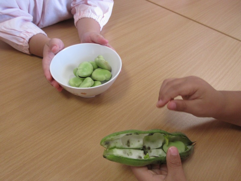 皆にそら豆が配られていくと、じーっと皿の中をのぞいている子ども達。