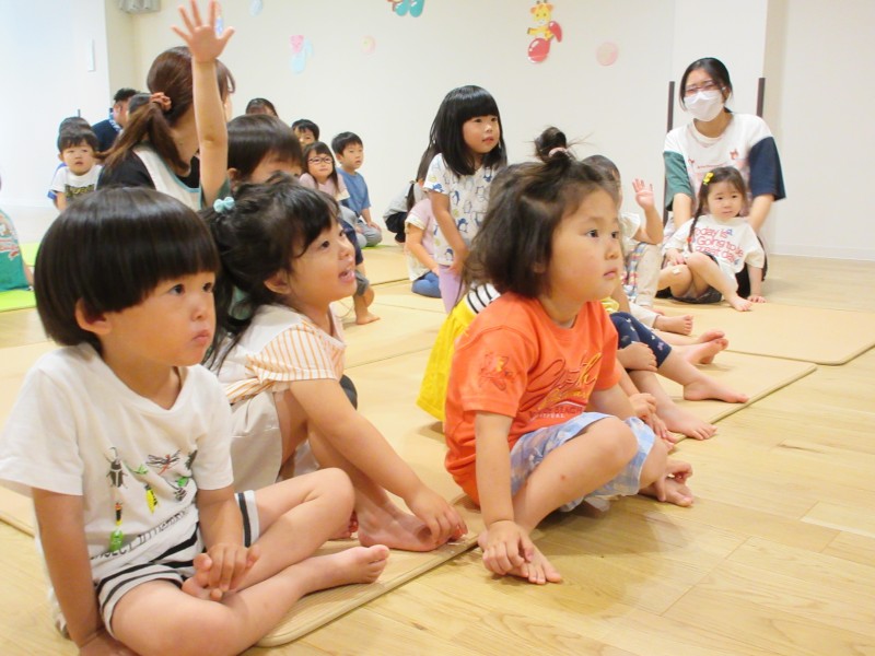 最初のお話は、リトミックの紙芝居です!みんな立って元気いっぱい