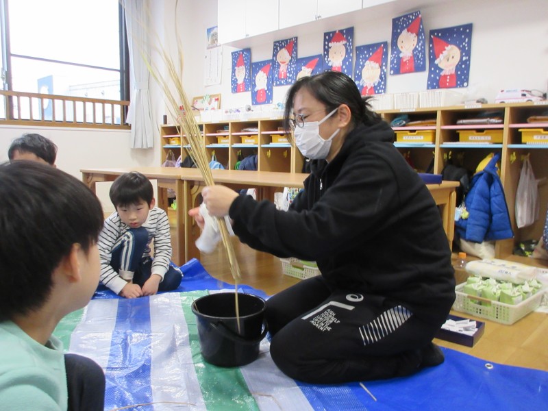 はじめに、穂をカットしたわらを濡らします。「こうするとわらが柔らかくなるんだよ😊」「なるほど~😐😐」