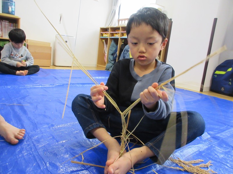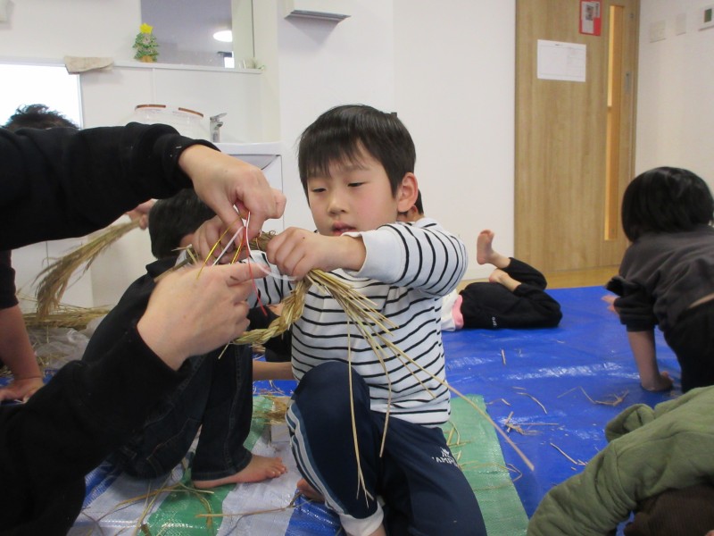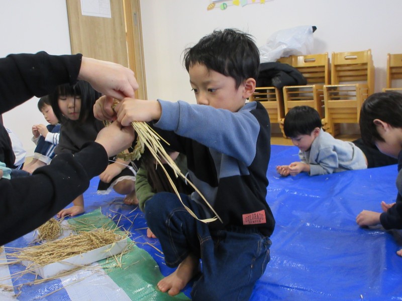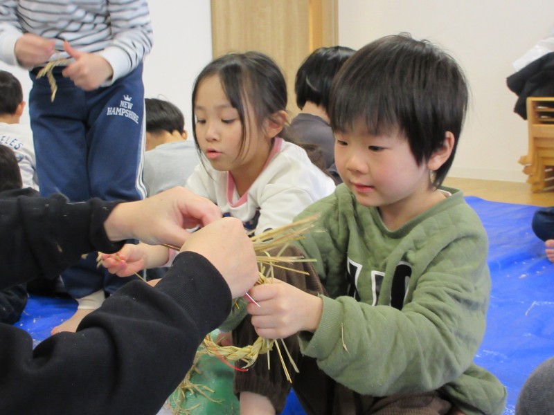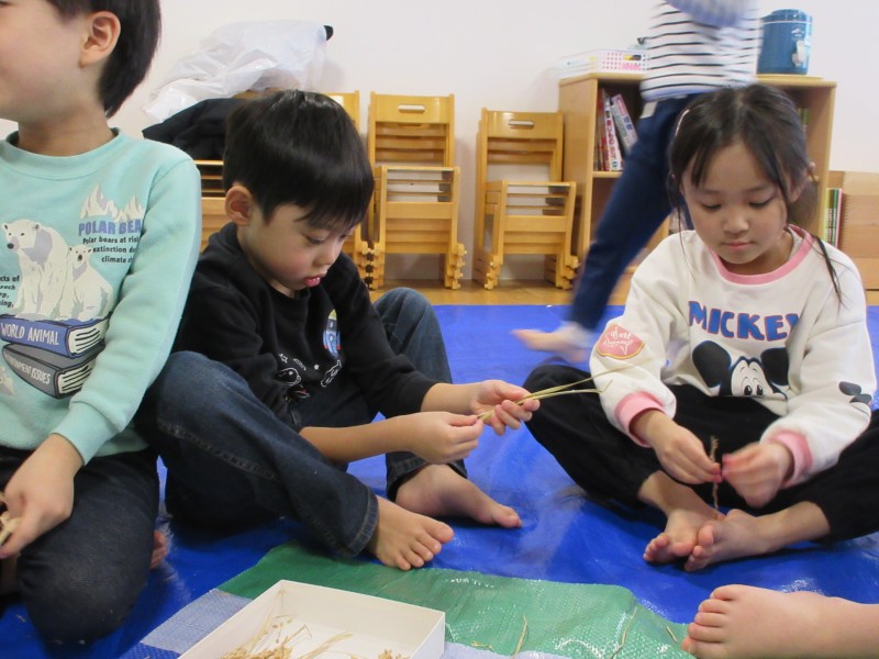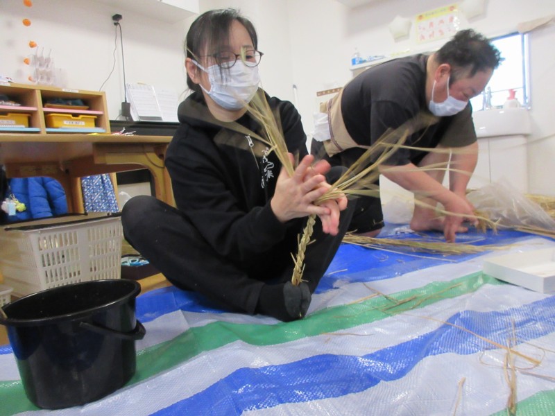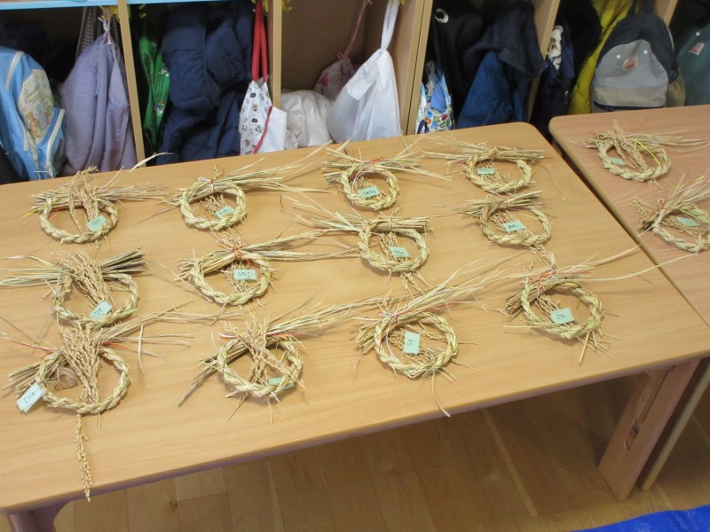 素敵なお正月を迎える準備として、年末に、雁音米の小野寺さんに来園していただき、お正月飾りを作りました。