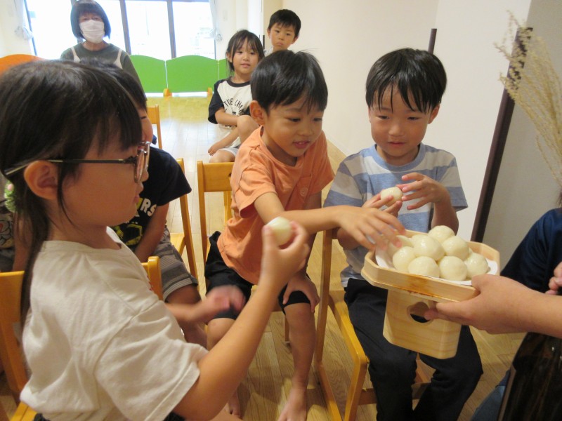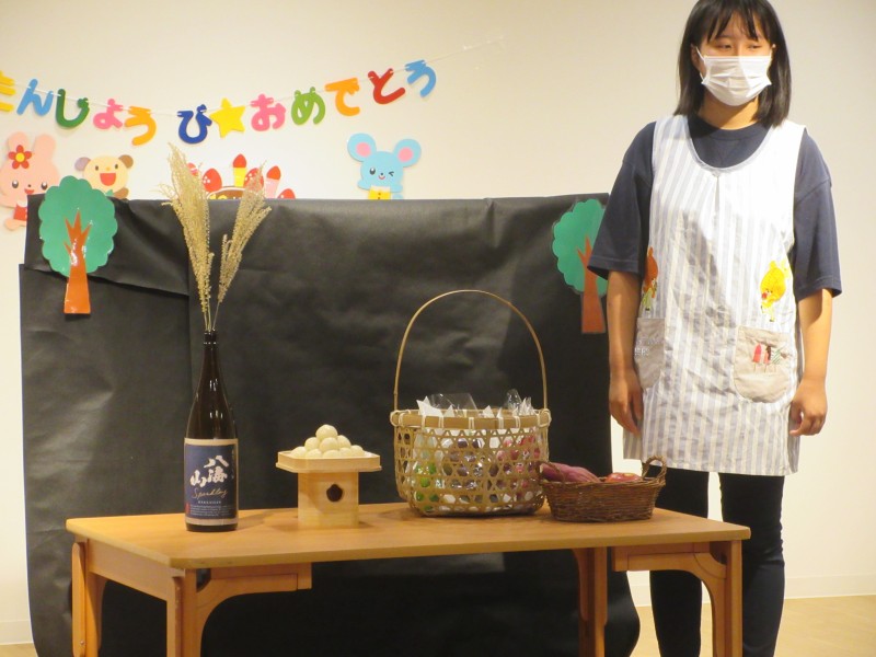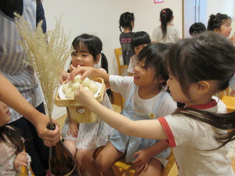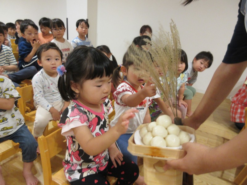 お月見の日は1年の中で1番月が丸いこと、果物や団子、ススキを飾る事などお話をしました。
