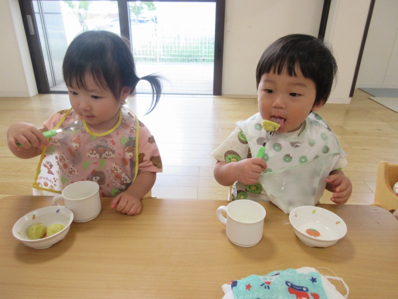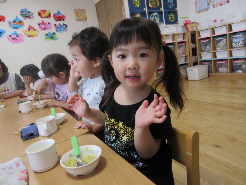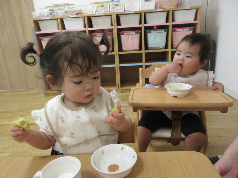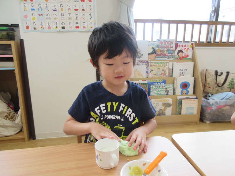 団子を手に持って、「気持ちいい😁」や「モチモチしてる😋」など感触を楽しんでいました。