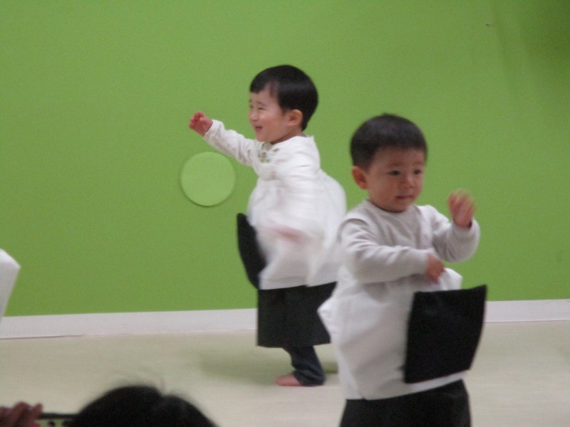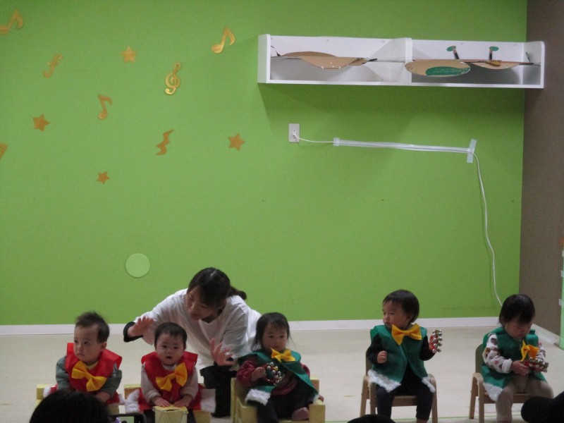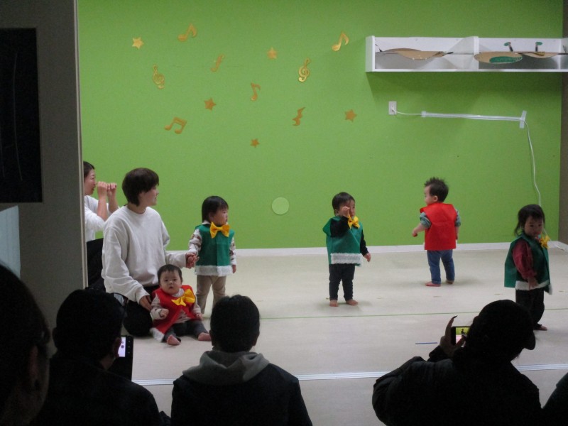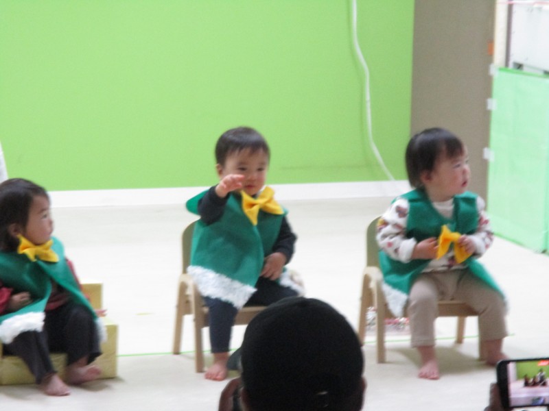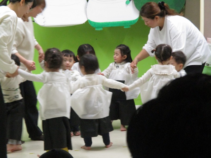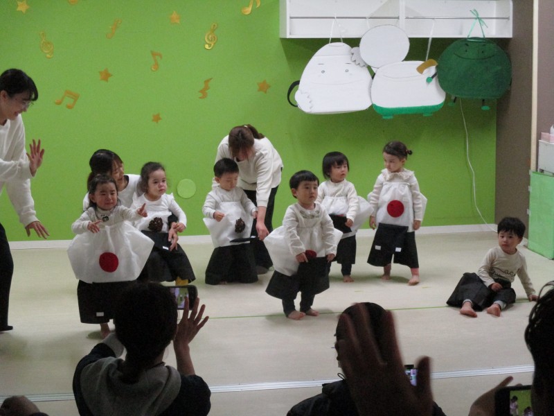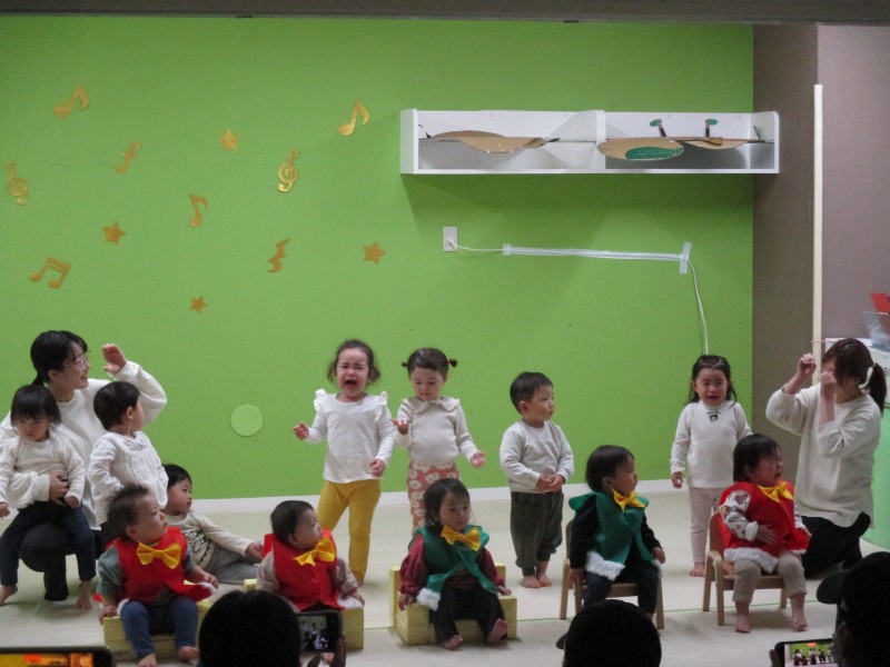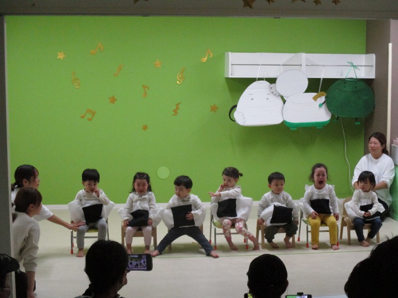 初めてのお楽しみ会に参加する子が多かった今年は、緊張で泣いている子もいましたが、保育士たちと一緒に最後までステージにいることができて、子どもたちの頑張りがとても伝わってきたお楽しみ会でした。