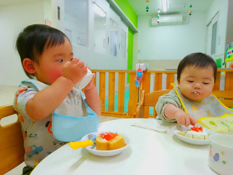 まずは牛乳から~とごくごく飲んでいるKくんと、お口にクリームをくっつけて味を吟味しているMちゃん