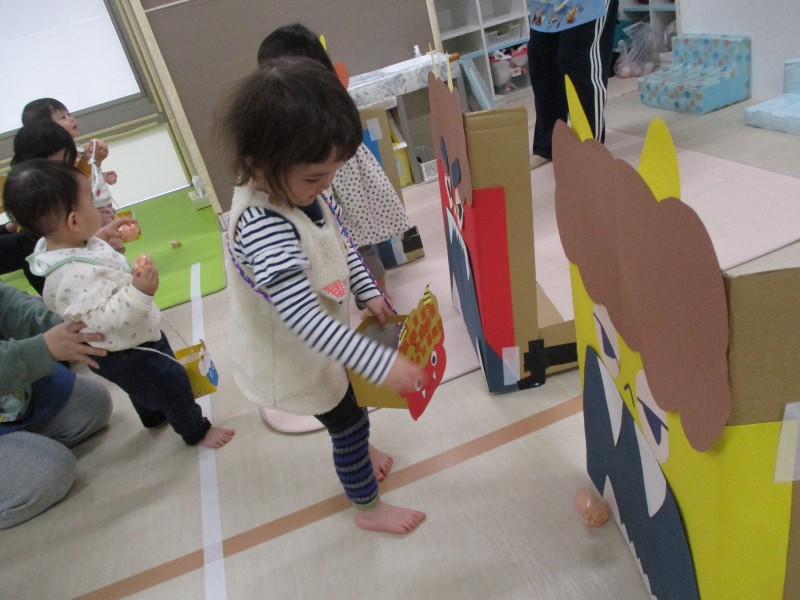 「おにはそと!ふくはうち!」と、鬼の的にめがけて豆ボールを投げるぱんだ組さん。