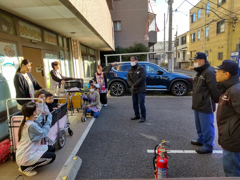 まずは避難訓練を見てもらい、消火や通報の仕方について教えてもらいました。