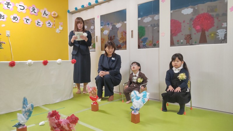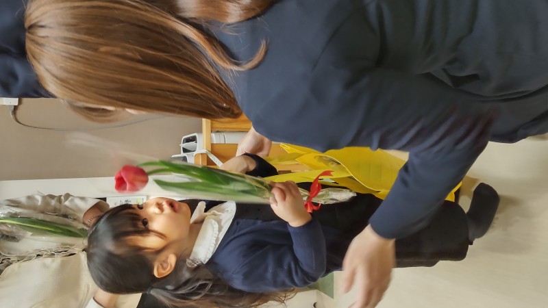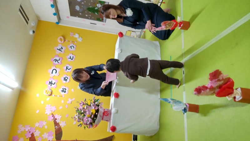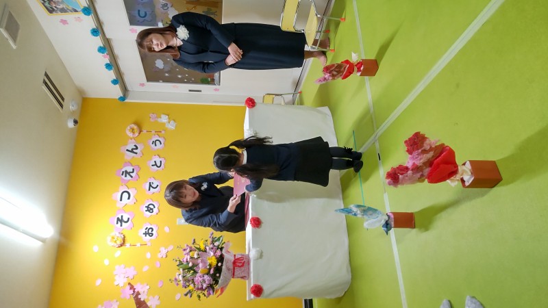 先生からの卒園記念のプレゼントとお花をもらい、式は終了です。