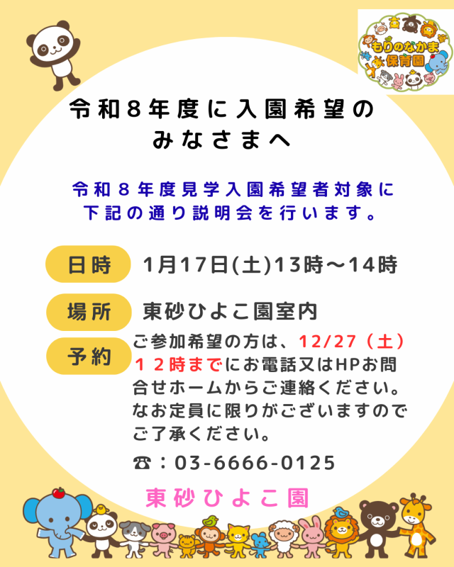 お知らせ 日付:2025.12.12 🌟【令和8年度 見学入園説明会について】🌟 【令和8年度に入園希望の皆さまへ】 令和8年度見学入園希望者対象に下記の通り説明会を行います。 日時:1月17日(土)13時~14時 場所:東砂ひよこ園室内 予約:ご参加希望の方は、12月27日(土)12時までにお電話または HPお問合せホームからご連絡下さい。なお、定員に限りがございますので ご了承ください。 お待ちしております😊 ☎03-6666-0125