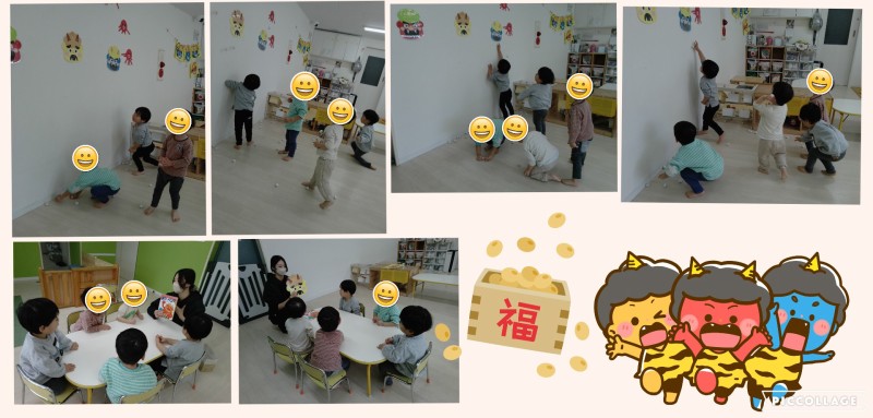 壁に貼った鬼に向かって、豆代わりのボールを一生懸命に投げていましたimpact