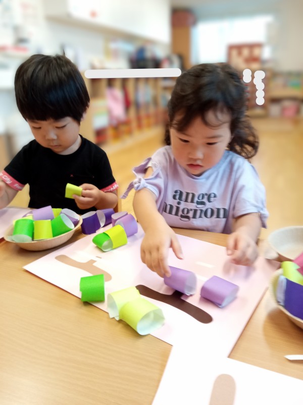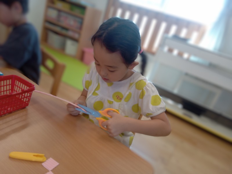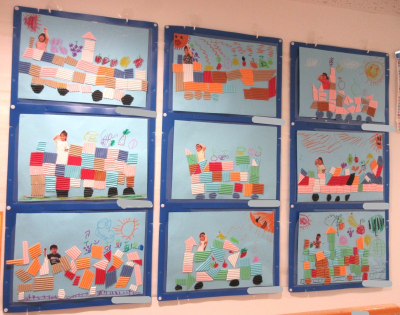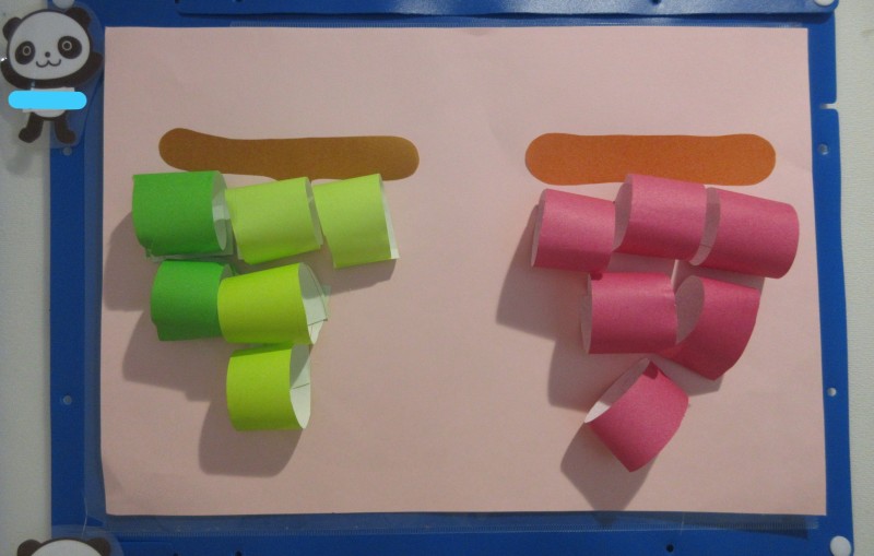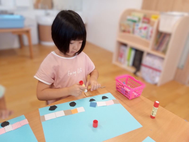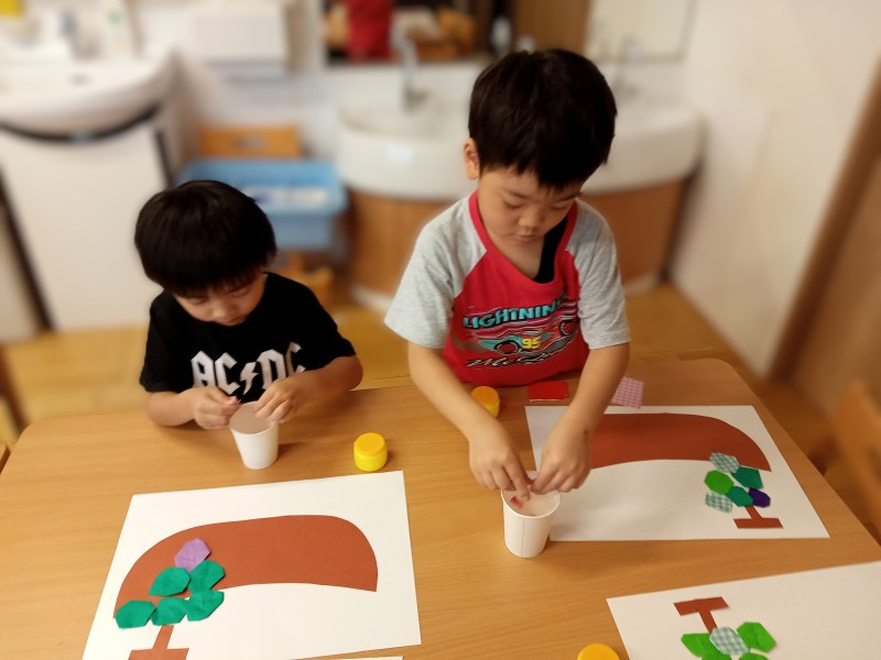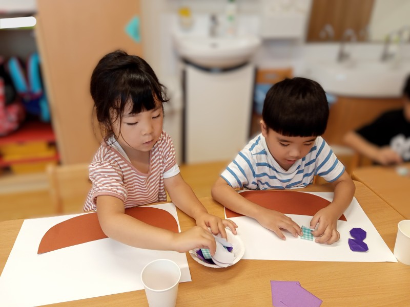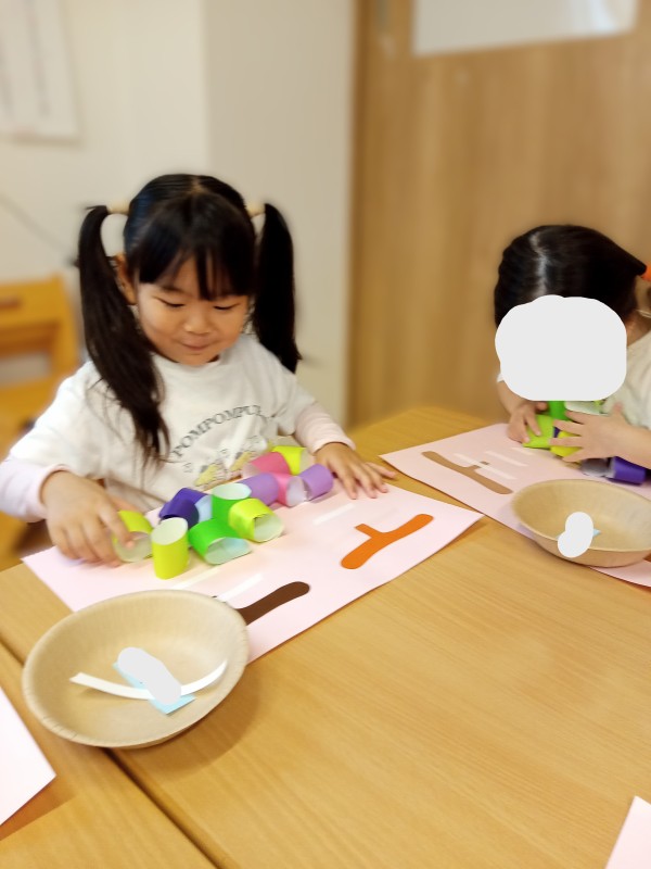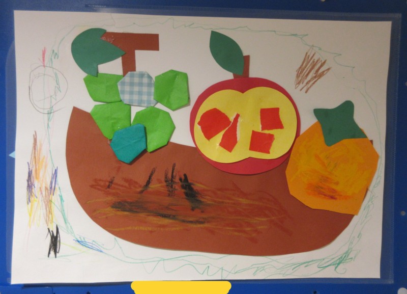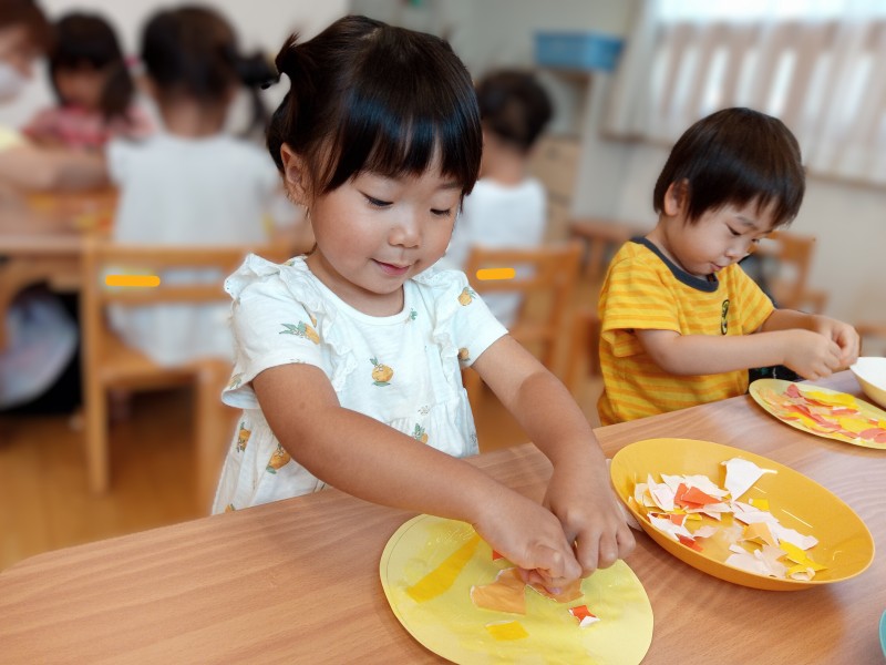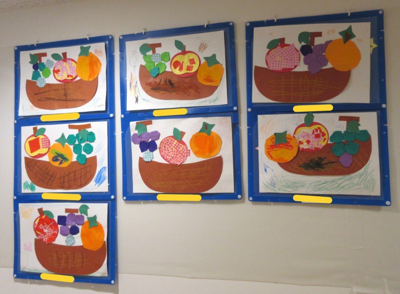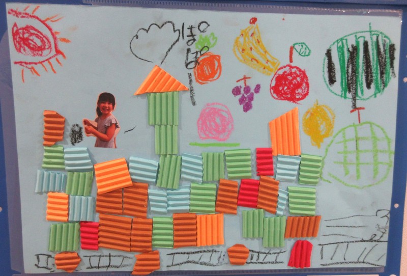 折り紙をちぎって貼り絵をしました🍎🍇🧺