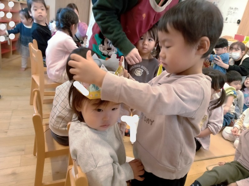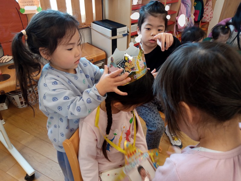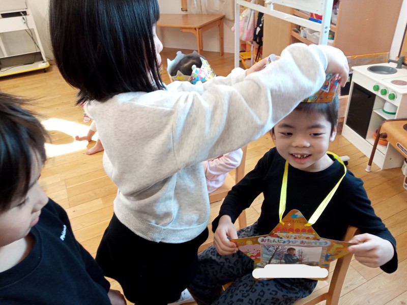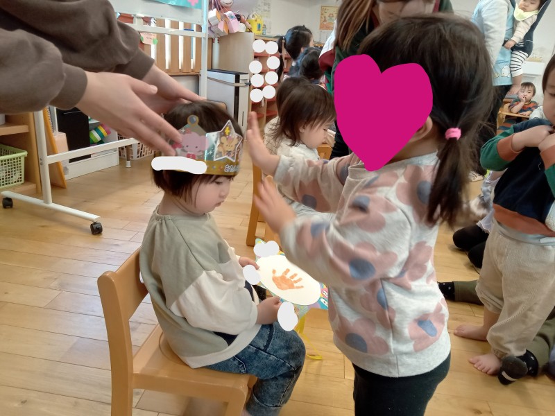 冠👑と誕生カードを大好きなお友だちから渡してもらい 嬉しそうなお誕生児さんです✨