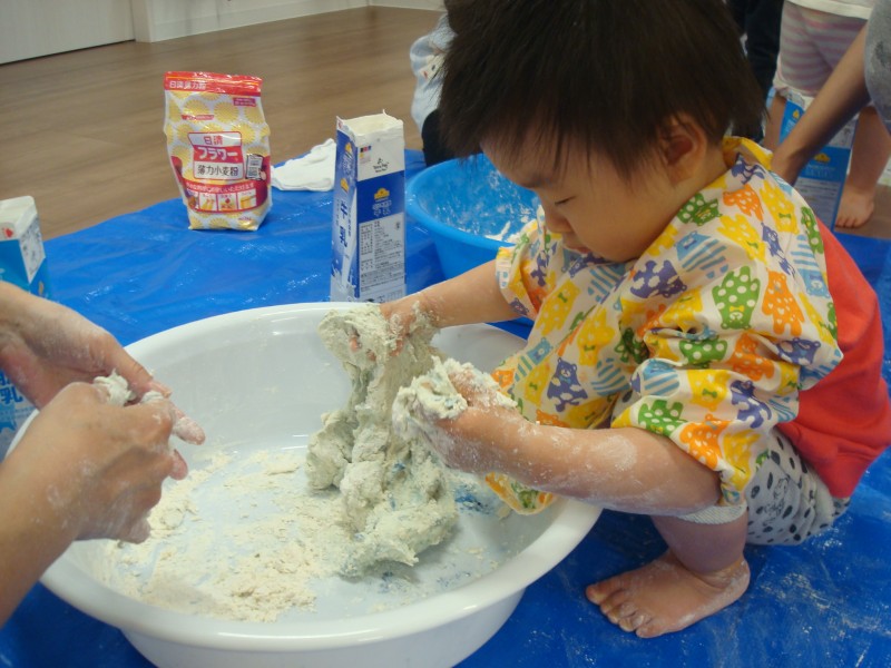 小麦粉から粘土に変わっていく様子や感触を楽しみながら、夢中になって行っていました![]()