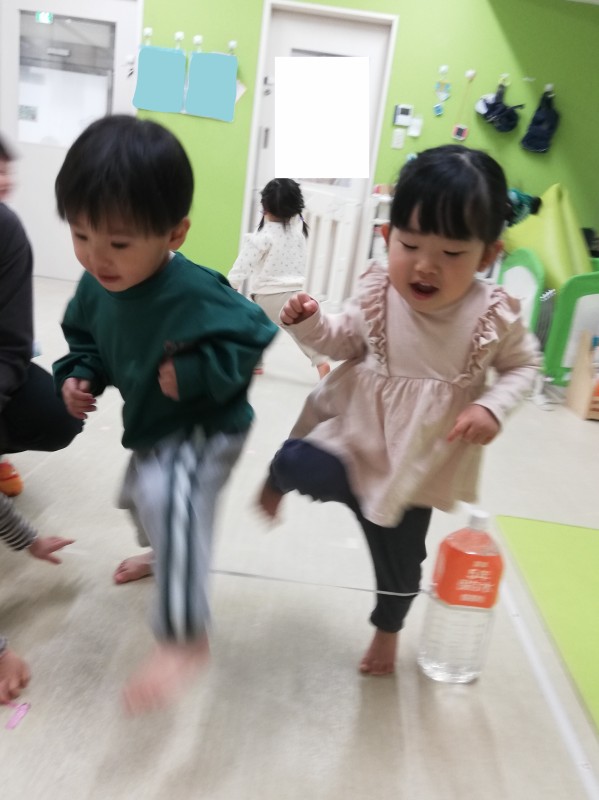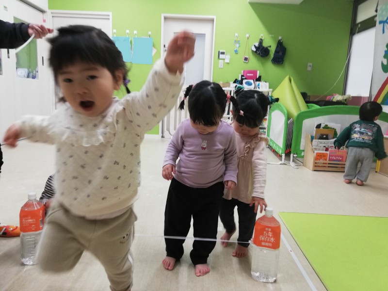 ペットボトルにゴムひもをつけて跨いだり、くぐってみたり...