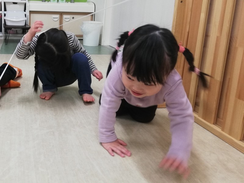 ゴムひもを使って、身体を動かして遊びました💪