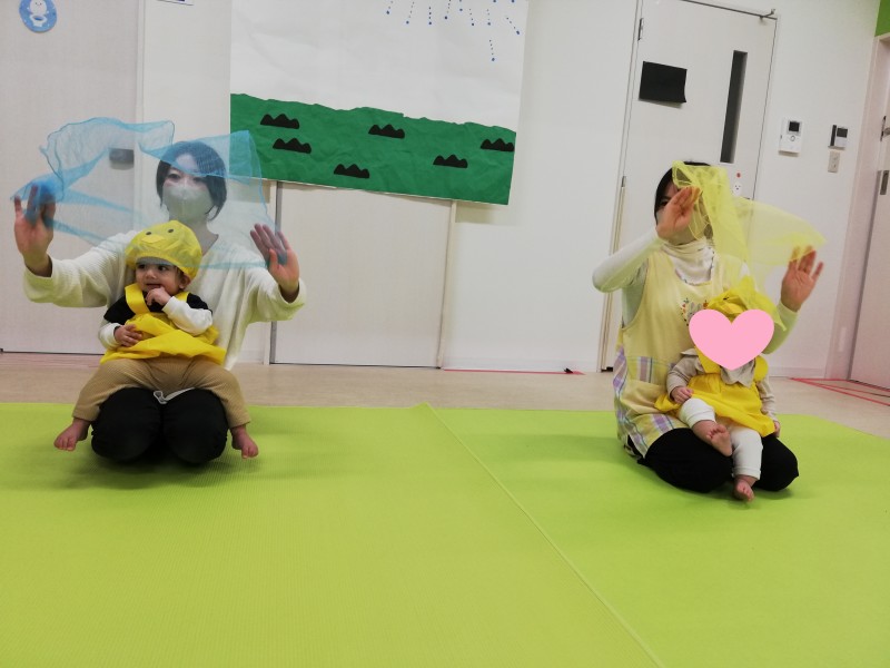 スカーフを使ったわらべうたやふれあい遊びをしたり、