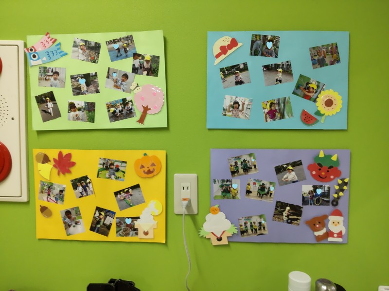 春・夏・秋・冬の子どもたちの写真でお部屋を飾り、一年間思い出を振り返りつつ卒園式が始まりました。
