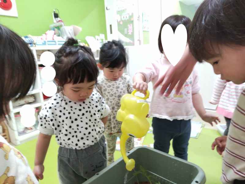 水をあげて「おおきくな~れ」と声をかける子ども達💦