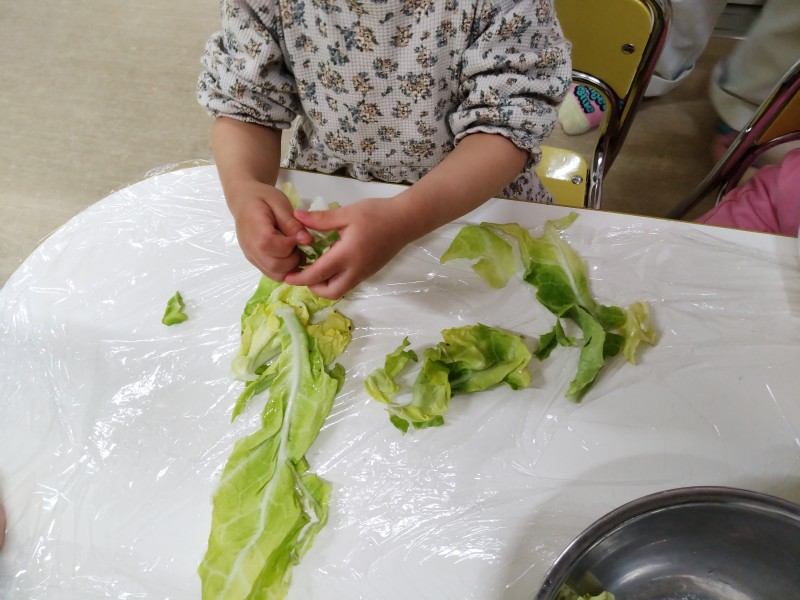葉っぱをむきむき。食べやすいサイズにちぎっていきます。