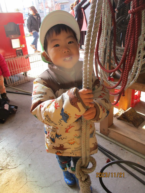 待っている間は防火服を着させてもらいました😝(重たいよ…💦)「よいしょよいしょ」と言いながらロープを登ったりもしました。