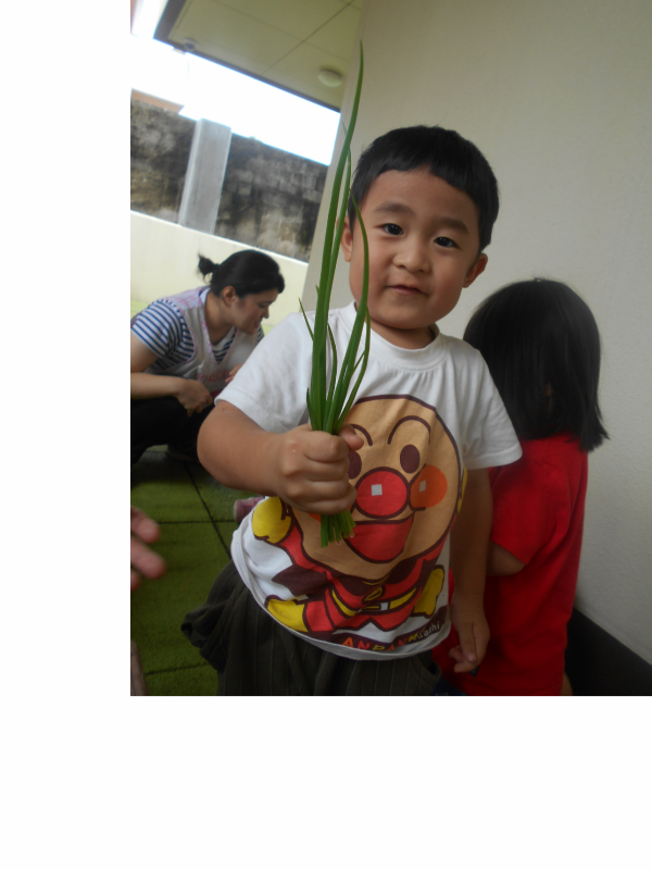 イベント 日付:2019.06.29 ネギ収穫 5月に「夏野菜」の苗を植えました 毎日、大きくなっていく様子を観察していま~す ネギの苗を見て興味津々で~す 水やり頑張っていま~す 先日、みんなで「ネギ」の収穫できました こんなに大きくなりました