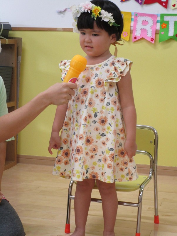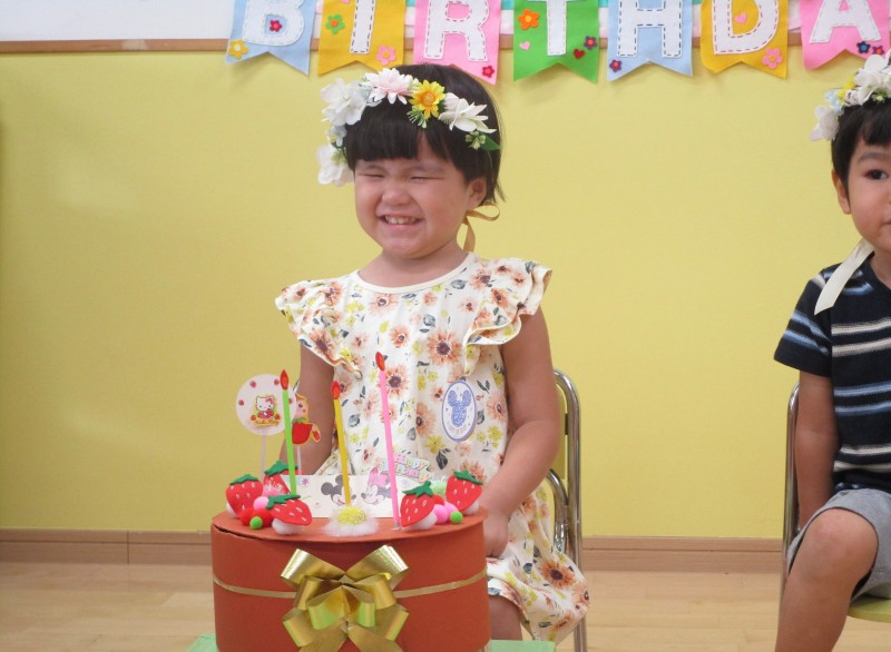 イベント 日付:2021.09.18 9月のお誕生会💓 9月のお誕生会をしました。まずは、主役の入場です。 次はインタビューを受けます。ドキドキしながら頑張ります! 次は誕生日ケーキの登場。ケーキを前にこの笑顔です。ろうそくの日もフーっと消します。 大好きな先生とお友達から、プレゼントももらいました。 そして、待ちに待った先生たちの出し物の一つ、三線の演奏です。歌を歌った後は、みんなでエイサーをしました。 おやつには、可愛いケーキを作ってもらいました。おいしそうだね。いただきます!