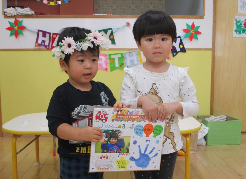 そして記念撮影。まずは2歳児のうさぎ組さんから。余裕の笑顔です。