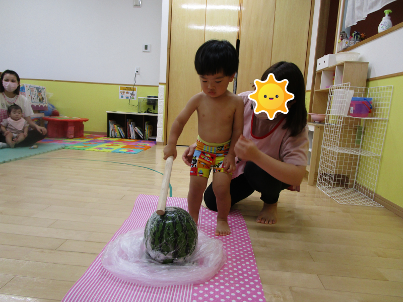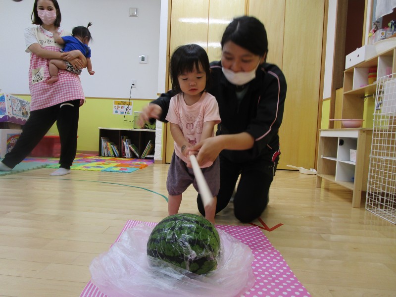 イベント 日付:2022.07.25 スイカ割り🍉 7月13日、水遊びスタートの日。スイカ割をしました。 大きなスイカを見て、みんな驚いています。 そしていよいよスイカ割のスタート。みんなで挑戦。でもなかなか割れないなぁ。 なかなか割れないので、先生たちも、挑戦! やっと割れました!みんなでおいしくいただきました。