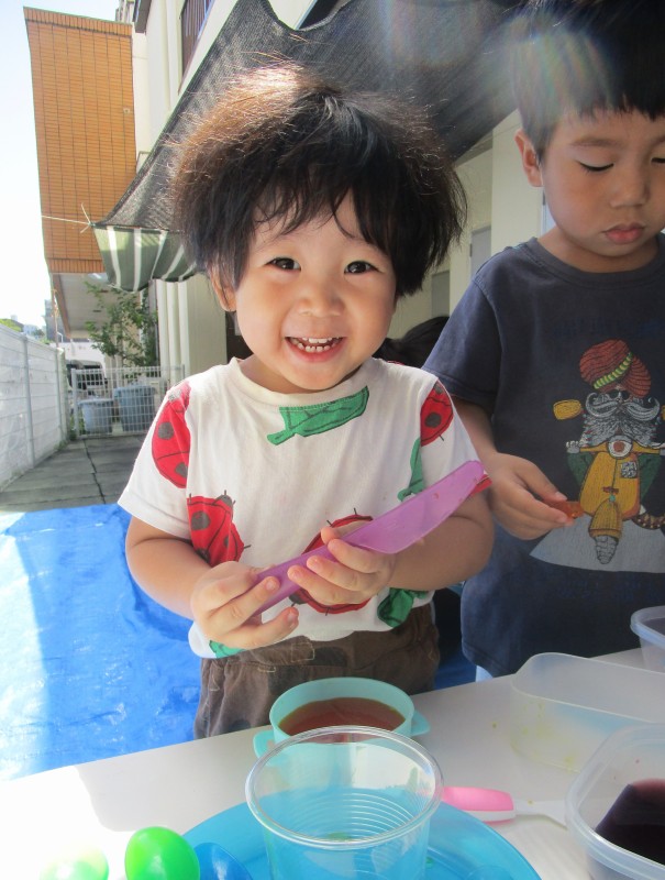 イベント 日付:2022.08.27 寒天遊び🌞 暑い日が続いていますが、元気いっぱいの子ども達。先日、お外で寒天遊びをしました。 とても楽しそうに遊ぶ、子ども達です。 寒天をいろいろなものに見立てて、ままごと遊びをしたり、寒天の感触を楽しんでいました。
