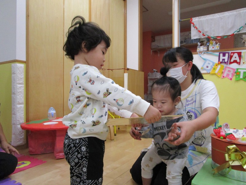 イベント 日付:2023.01.07 12月のお誕生会🎂 12月のお誕生会の様子です。 体調不良でお休みしている子がいて、0歳児のお友だち1人のお祝いになりました。泣いちゃうかな、と心配しましたが、ニコニコ笑顔で、とても可愛い姿を見せてくれました。 お友だちにカードをもらったり、みんなで先生の出し物を見たり、楽しい時間を過ごしました。 お誕生日おめでとう!素敵な一年になりますように。