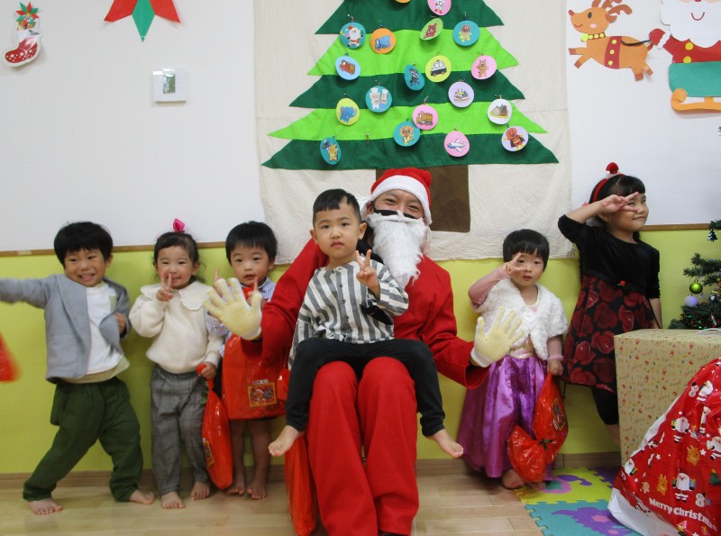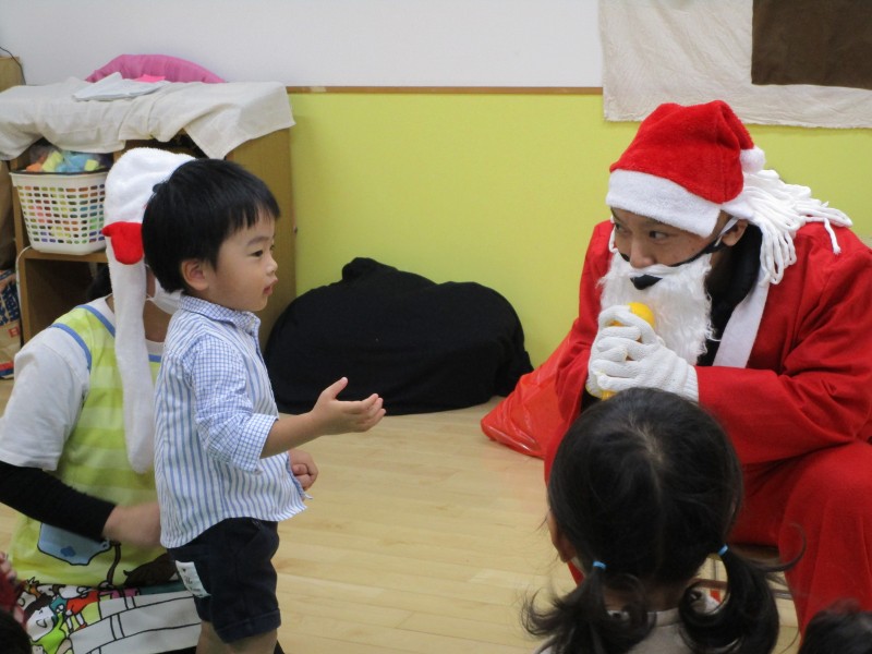 イベント 日付:2023.01.07 クリスマス会🎄 12月23日に、クリスマス会をしました。 最初は、先生たちの出し物を見ました。 その後、大きなプレゼントから、サンタさん登場! 子どもたち、目がくぎ付けです! いろいろ質問もしましたよ。 それから記念撮影。ちょっぴり緊張している子どもたちです。 サンタさん、プレゼントたくさんありがとう!来年もまた来てね。 その日のお食事は、楽しいクリスマスバイキングでした。